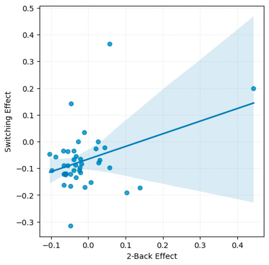 A significant moderate positive correlation emerged between the emotions effect in the 2-back task and the set-switching task, r(39) = 0.38, p = 0.014 (see Figure 3). This finding suggests that participants who showed greater emotion-related accuracy impairments in the WM task tended to exhibit similar patterns in the set-switching task. No significant correlations were found between the Go/No-Go task and either the 2-back or the set-switching task.