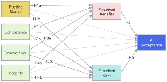 The Psychological Framework of Public Acceptance of AI. Note. Hypotheses 1–6 specify the direct pathways among constructs. Hypotheses 7–8 propose that the effects of trust dimensions on AI acceptance are mediated through perceived benefits and perceived risks, corresponding to the indirect pathways illustrated in the model.