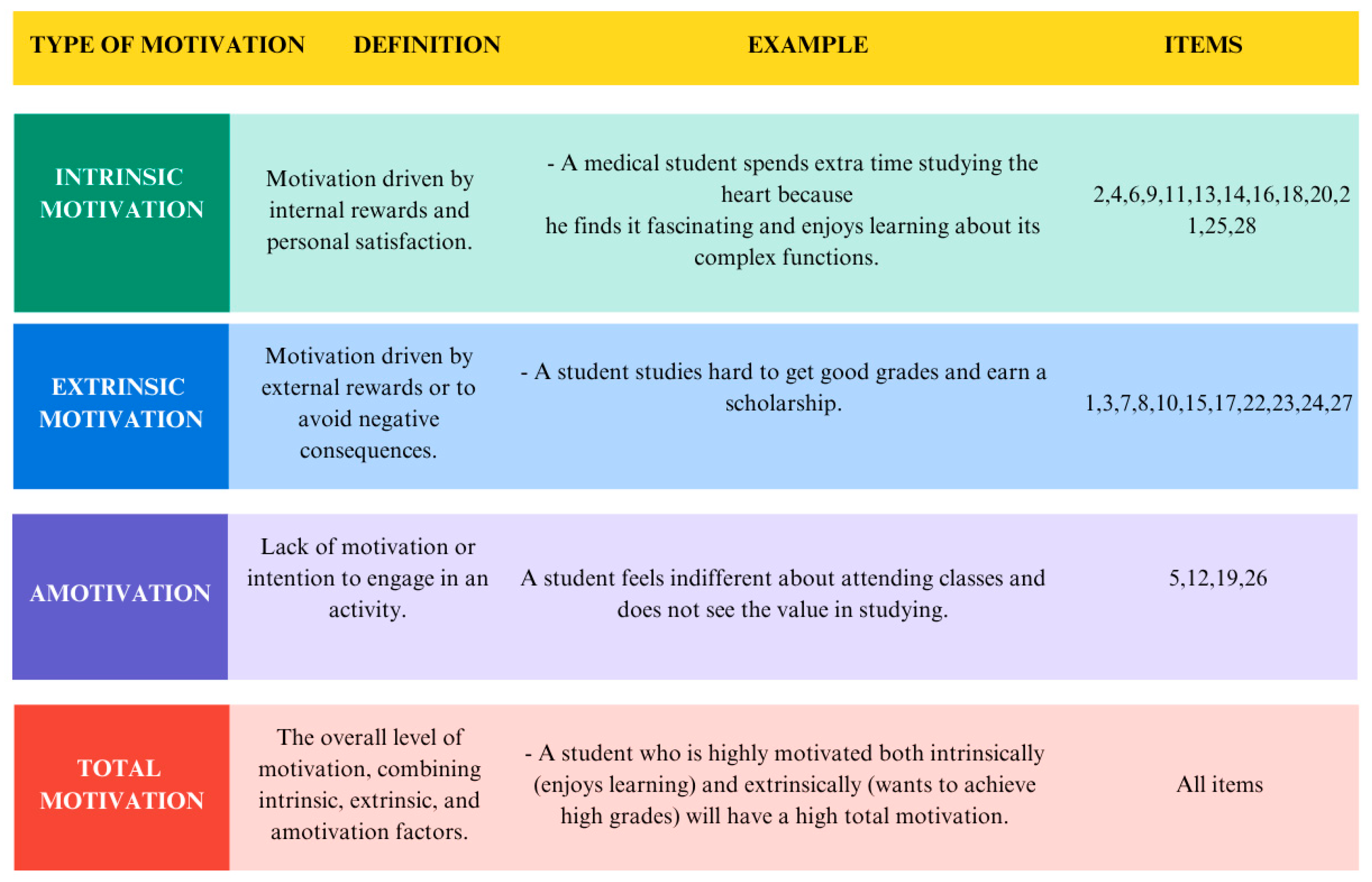 Higher education institutions (HEIs) prepare future medical doctors to meet the complex demands of modern healthcare, requiring not only medical knowledge and clinical skills but also motivation, resilience, and ethical competence (Bin Abdulrahman et al., 2023). Medical education presents unique challenges, including rigorous curricula, intensive clinical rotations, and emotional stressors that challenge students’ motivation, engagement, and performance (Bergmann et al., 2019). Understanding the psychological and contextual factors influencing these outcomes is critical for developing resilient, competent professionals. This study applies Self-Determination Theory (SDT; Deci & Ryan, 2000) which posits autonomy, competence, and relatedness as core drivers of intrinsic motivation and the Four Pillars of Academic Engagement (FPAE; Bowden et al., 2021) to explore motivational dynamics across medical training.