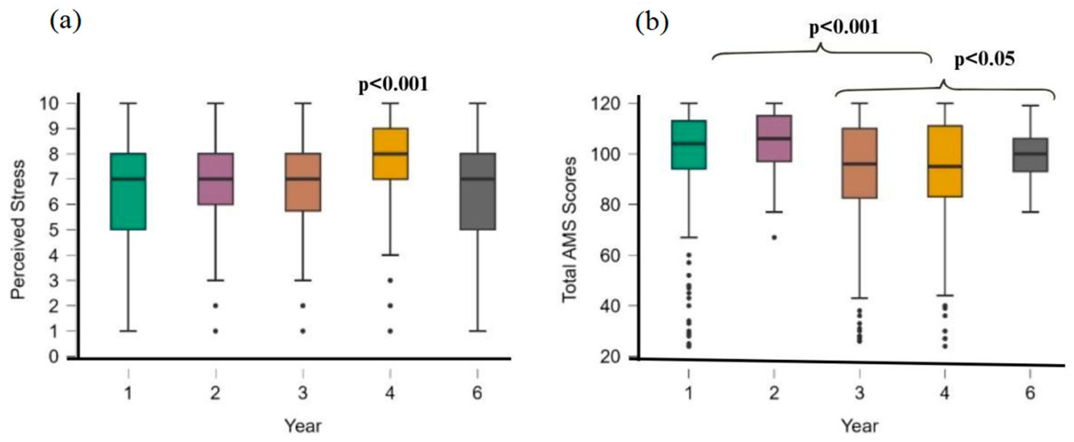 Figure 2. Kruskal–Wallis tests of years of study, perceived stress, and AMS scores. (a) Comparison of perceived stress and the year of study, (b) comparison of total AMS scores and years of study.