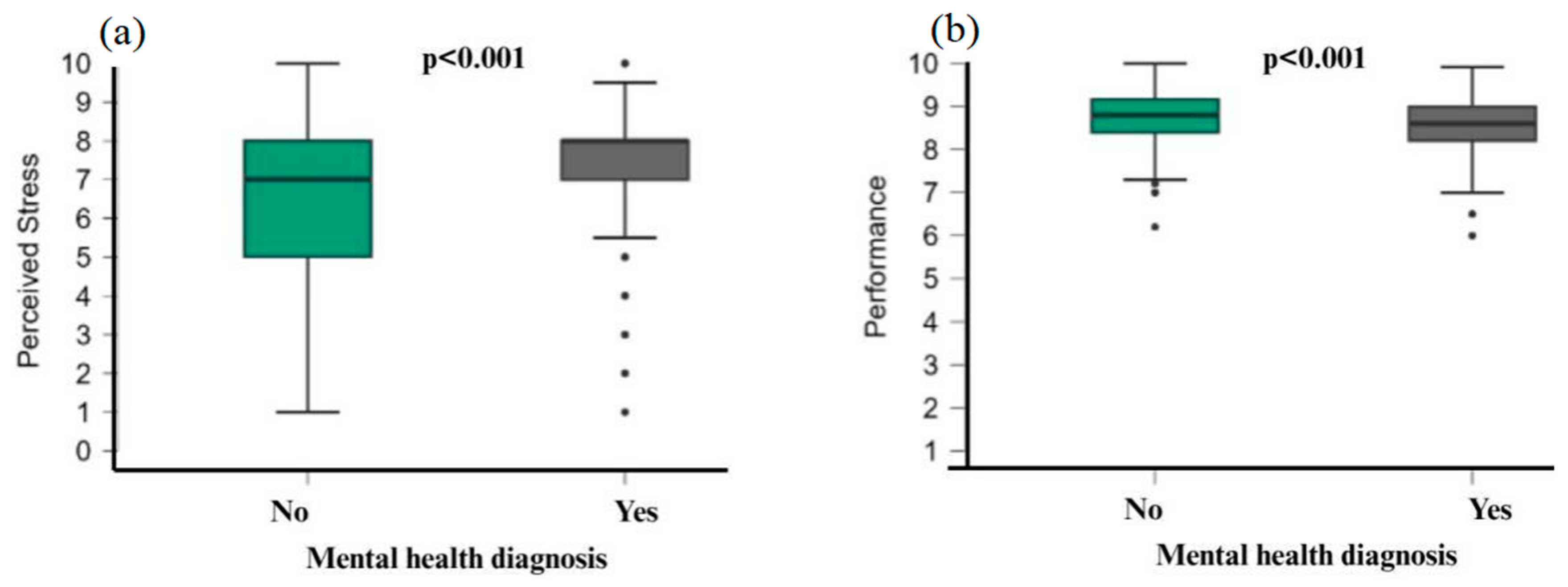 Figure 3. Mann–Whitney U test. (a) Perceived stress in students with mental health diagnoses, (b) performance of students with mental health diagnoses.