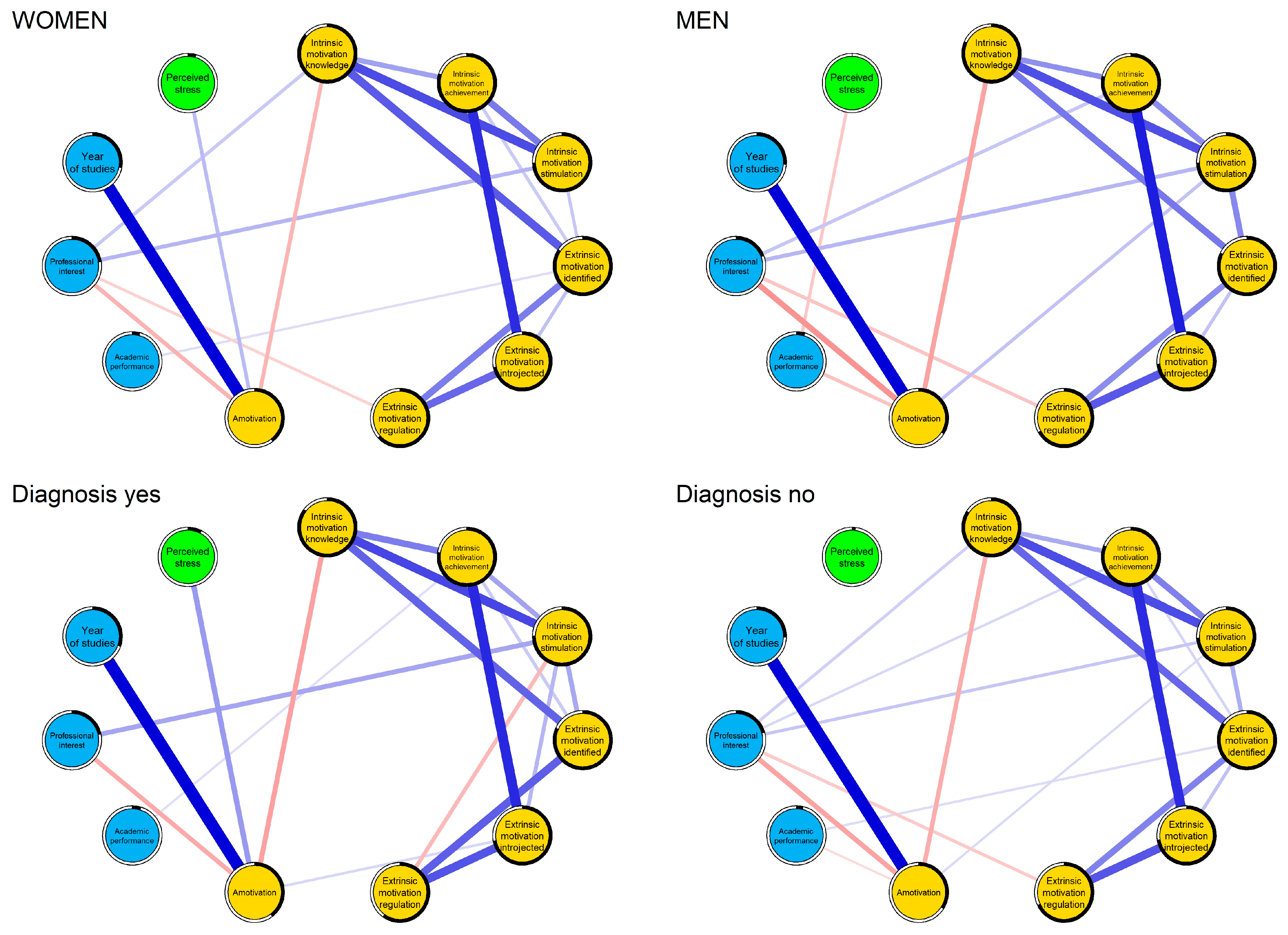 Figure 5. Comparison of network structures according to sex and mental disorder diagnosis. Yellow nodes correspond to academic motivation, light blue nodes to academic factors, and green nodes to mental health.