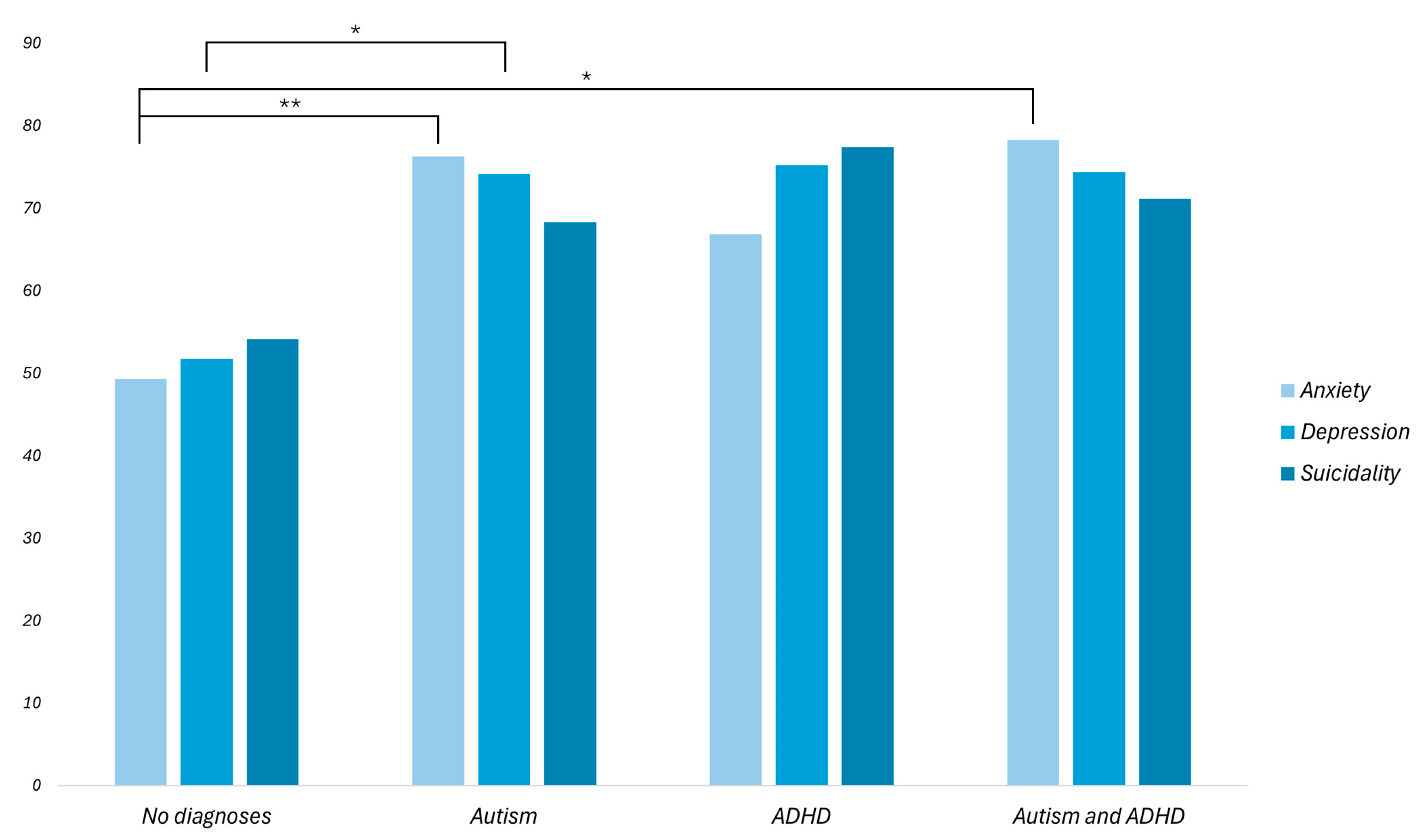 - Sun, Y., Huang, Z., Xu, S., Wang, Y., Wang, J., Lei, C., Li, W., Wang, Y., Qu, D., & Chen, R. (2024). Suicide risk with ASD traits or ADHD traits in non-clinical young adults. Humanities and Social Sciences Communications, 11(1), 1186. [Google Scholar] [CrossRef]
