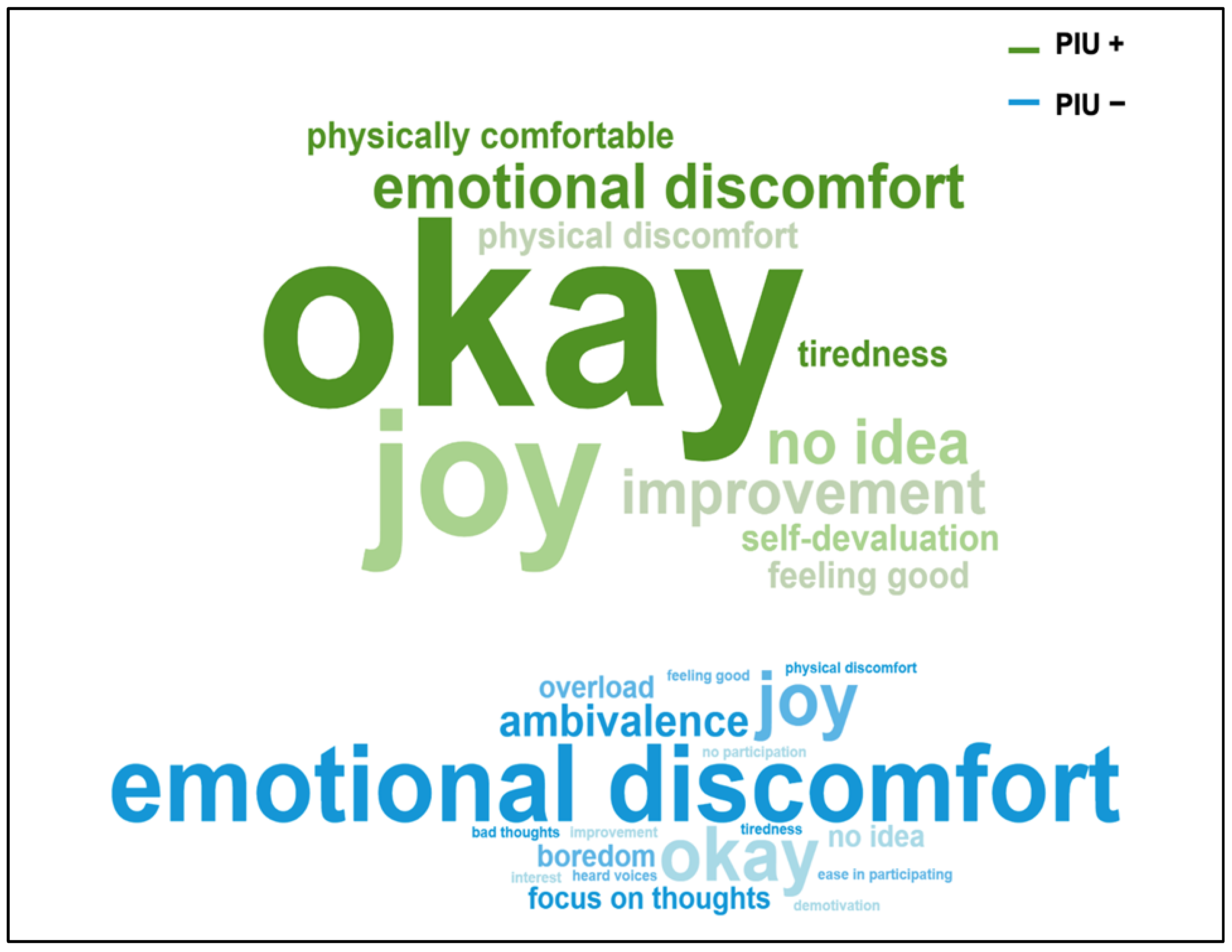 3.3. Narrative Feedback Evaluation Across All Workshops for Subgroups PIU+ vs. PIU−