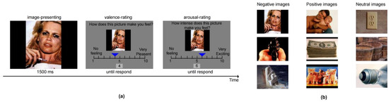Affect Rating Task (ART). (a) Task procedure. Participants viewed each image for 1500 ms and then completed two untimed ratings using the “left” and “right” keys to move the indicator and assess valence and arousal, and the next image appeared only after both ratings were finished. (b) Examples of images used in the ART. The first column shows negative images, the second shows positive images, and the third shows neutral images.