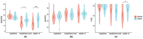 The clinical outcomes. Line charts of (a) MADRS, (b) Snaith-Hamilton Pleasure Scale (SHAPS), and (c) Fatigue Severity Scale (FSS) scores of participants in active and sham groups assessed at baseline (MADRS: Nactive = 26, Nsham = 25; SHAPS: Nactive = 25, Nsham = 24; FSS: Nactive = 25, Nsham = 24), the last day of treatment (SHAPS: Nactive = 21, Nsham = 23; FSS: Nactive = 20, Nsham = 23), and 4 weeks after treatment (SHAPS: Nactive = 21, Nsham = 23; FSS: Nactive = 20, Nsham = 23). Dots indicate estimated marginal means, and error bars represent 95% confidence intervals (CI) computed from the model’s standard errors. Significance: * p < 0.05; *** p < 0.001.