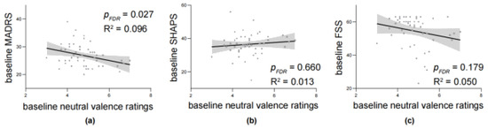The correlation between baseline image ratings and baseline clinical scales. The correlation between baseline neutral valence ratings and baseline (a) Montgomery–Åsberg Depression Rating Scale (MADRS), (b) Snaith-Hamilton Pleasure Scale, (SHAPS) and (c) Fatigue Severity Scale (FSS). Dots are represented as individual data. Shadows represent 95% CI. p-values adjusted for multiple comparisons using FDR correction.