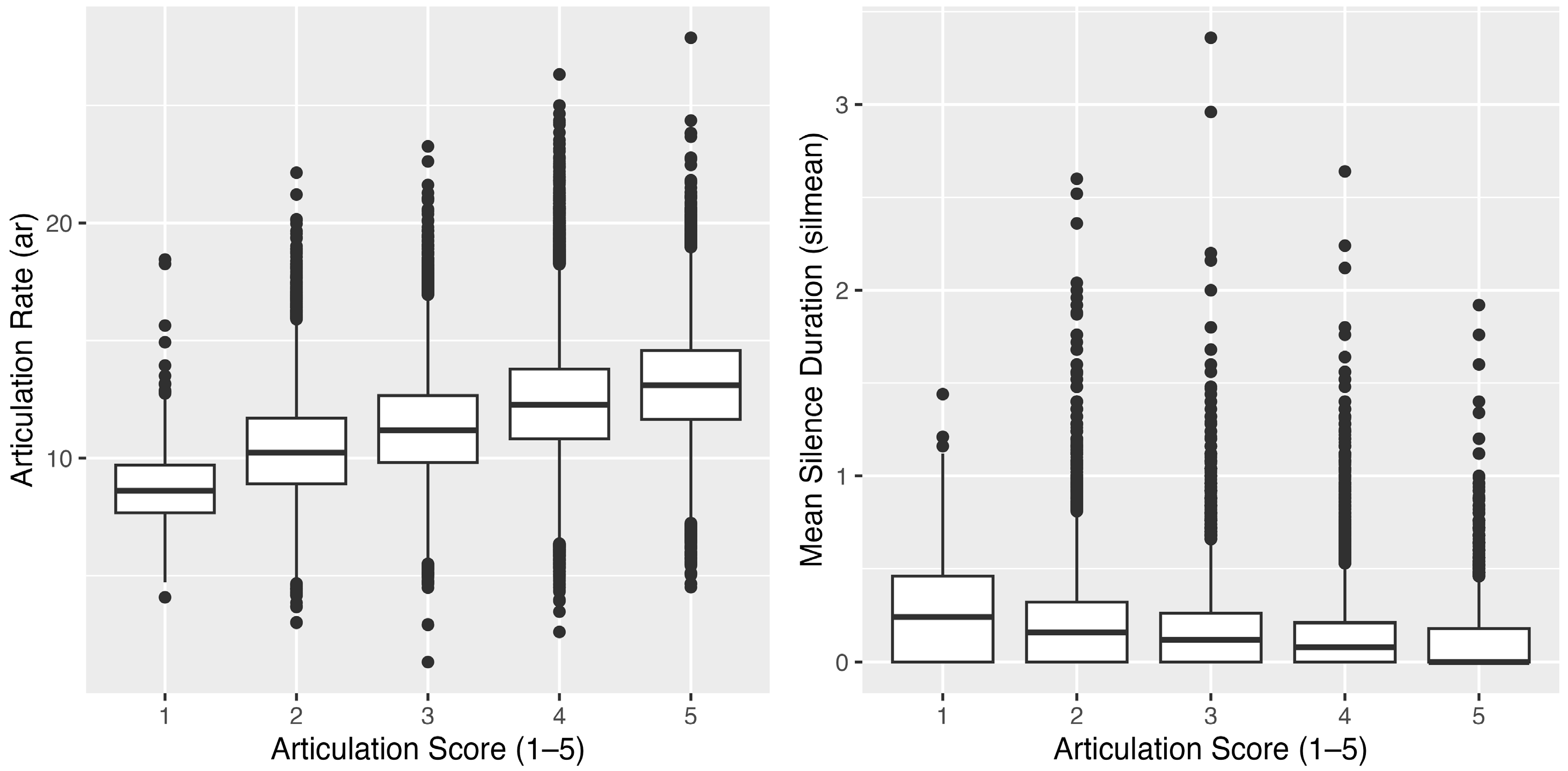 Figure 1 provides a visual exploration of the data. The figure comprises a series of box plots that depict the distribution of articulation clarity scores against two key speech characteristics: articulation rate and mean silence duration.