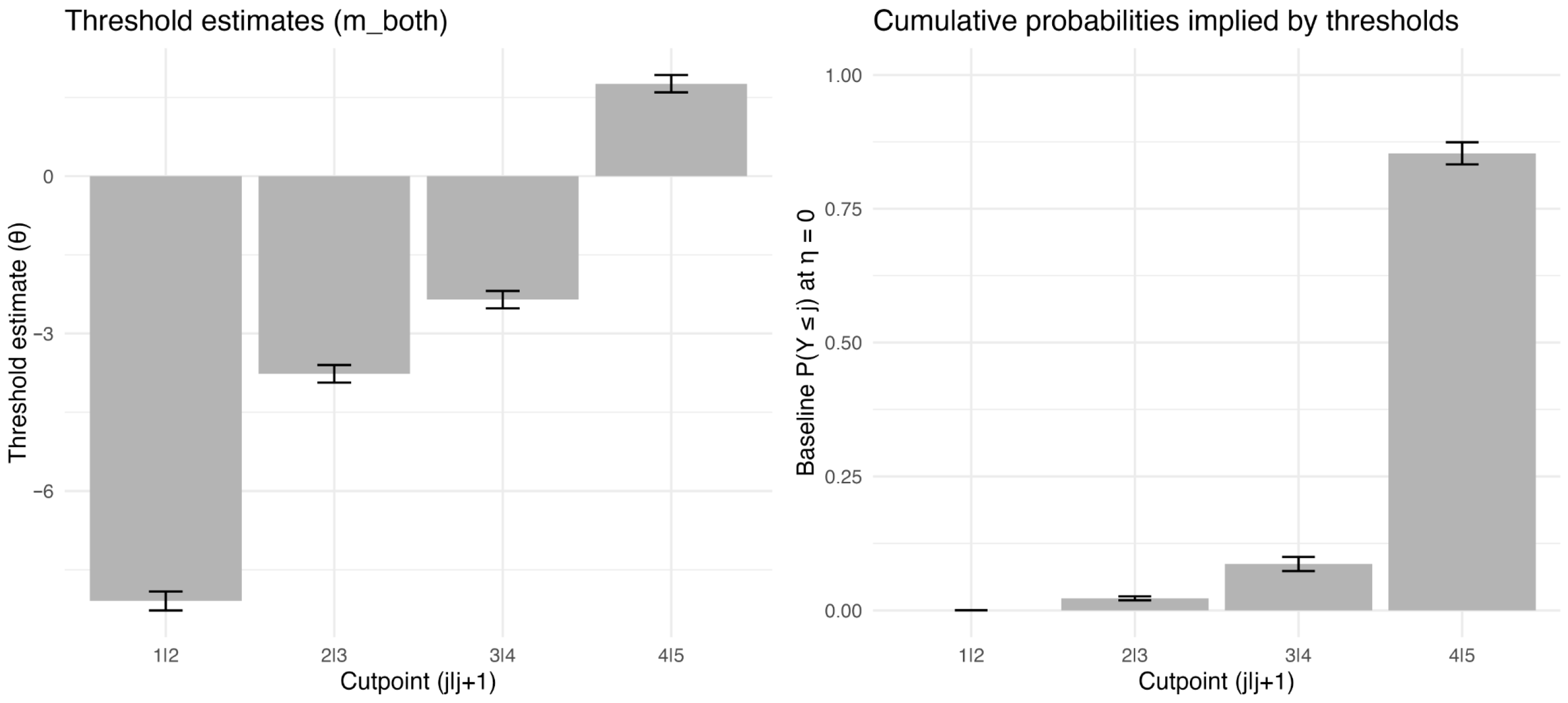 αj are found by maximizing the likelihood function based on the observed data. They define the boundaries between the ordinal response categories on the underlying latent scale. The “ordinal” package in R was used for this purpose (