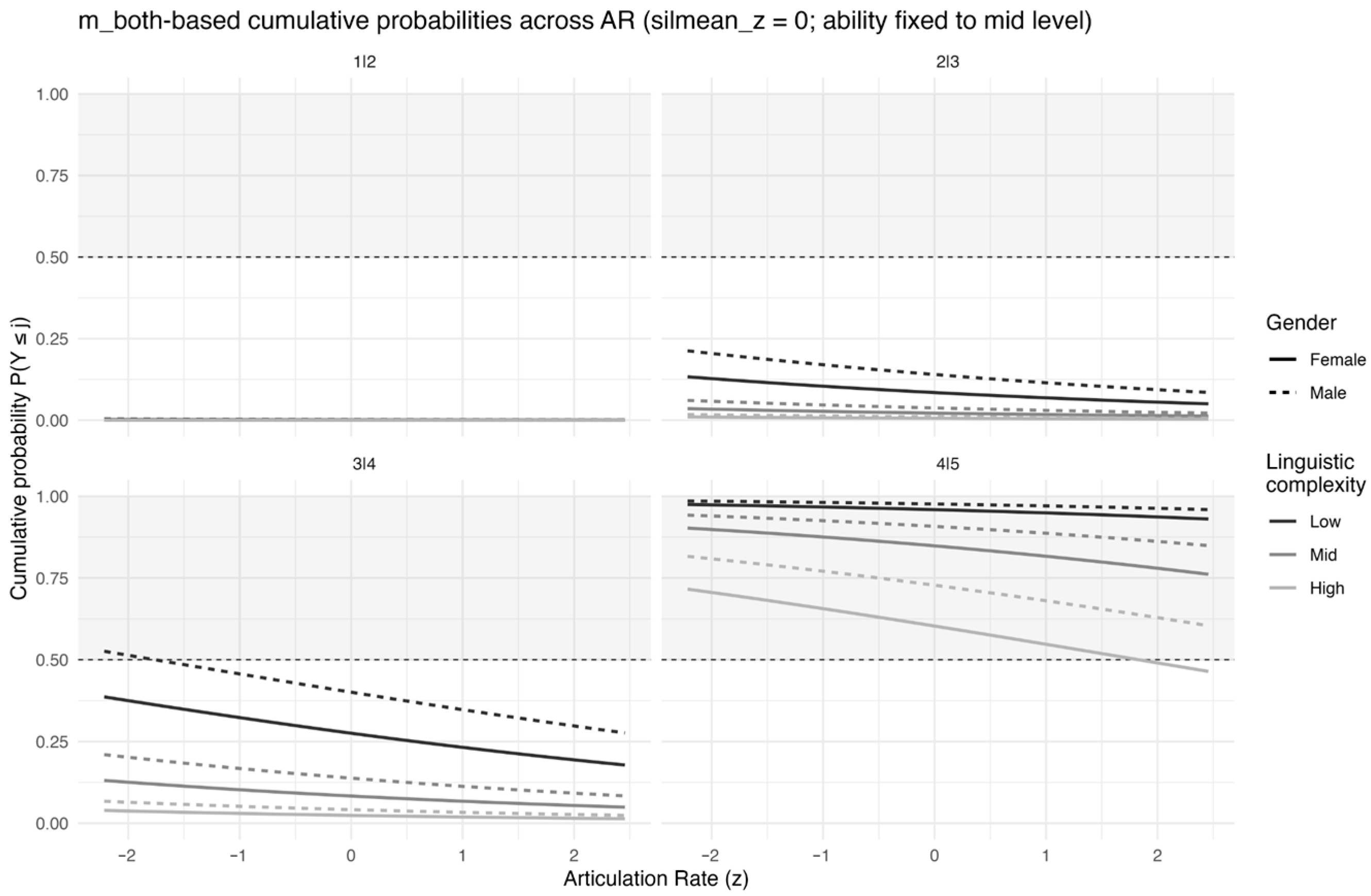 Formula (exploratory): artScore_5 ~ lingComplexity + ability + gender + age_z + testType + silmean_z * ability + (1 | SpeakerID) + (1 | scriptId).