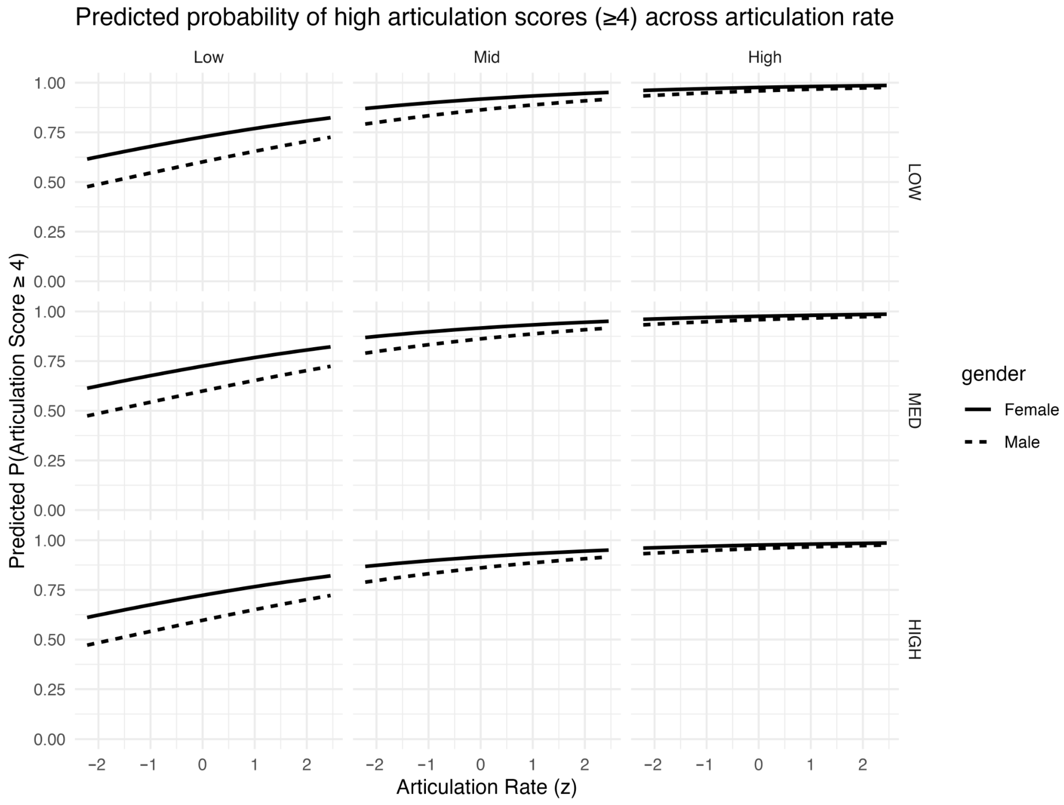 Given the complexity observed in the data, our next step is to develop a statistical model that can accurately predict articulation clarity scores. To achieve this, we will be employing a statistical model that incorporates factors such as gender and script difficulty level, alongside phonetic features like articulation rate and silence mean. This approach will allow us to better understand the relative impact of these variables on language proficiency and provide a more nuanced evaluation of pronunciation clarity beyond mere speech velocity, encompassing the thoughtful employment of pauses and the interplay of various prosodic elements essential for capturing the essence of a speaker’s linguistic ability.
