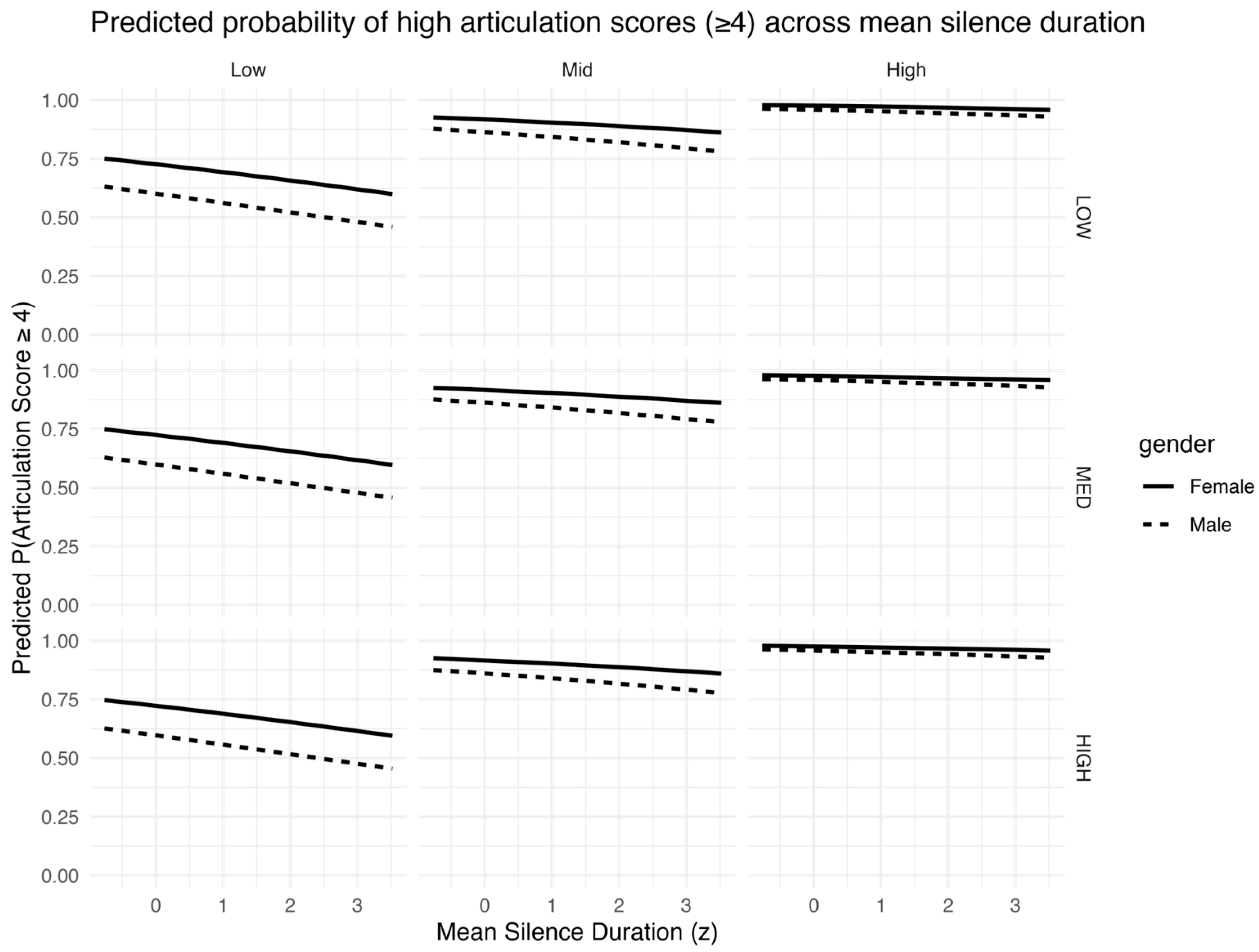 Whitfield & Goberman, 2017). A higher articulation rate might be expected to correlate with higher proficiency due to increased fluency. It is, however, possible even for highly proficient speakers to have a slower articulation rate. Articulation rate can vary widely among individuals, depending on several factors such as personal speaking style, context and formality, communication goals, age, and health. Conversely, a higher silence mean could potentially reflect more deliberate speech patterns, which may either enhance or impede clarity based on the context and the listener’s expectations. Long silences might serve to highlight structural boundaries in speech or introduce dramatic pauses for effect. These longer pauses can also indicate a speaker’s uncertainty or the need for cognitive processing time. Accordingly, the perceptual impact of pauses depends on both duration and placement, and pauses can serve discourse-planning functions in otherwise fluent speech (