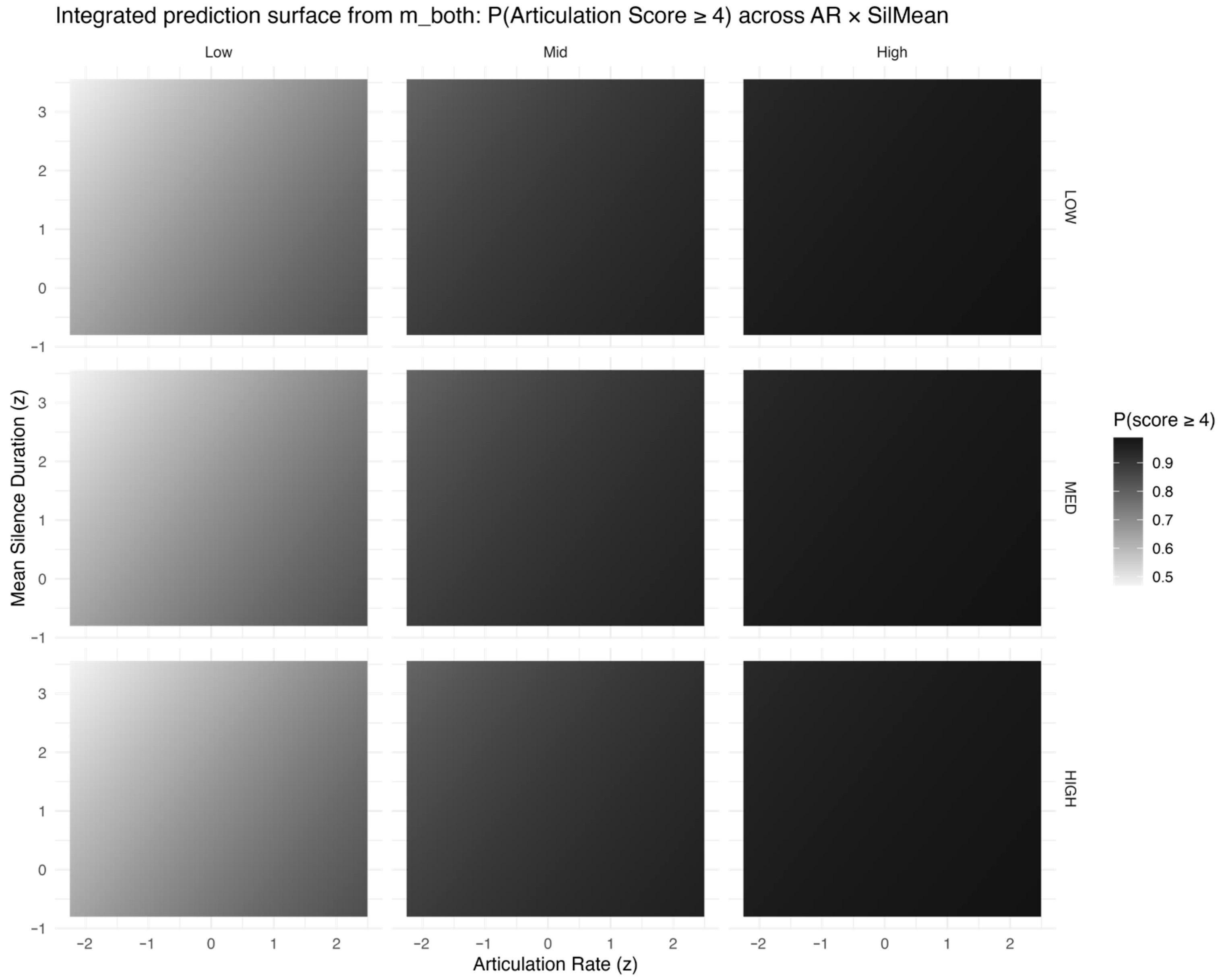 We fitted (i) an AR-only model, (ii) a SilMean-only model, and (iii) a combined model including both temporal predictors. Model fit was compared using AIC. In addition, we ran exploratory interaction models to test whether temporal effects vary by proficiency (ability). Finally, to examine construct alignment, we repeated the analysis using prosody scores (prosScore_5) as an outcome, because temporal cues are theoretically more central to prosodic fluency than to segmental articulation accuracy.