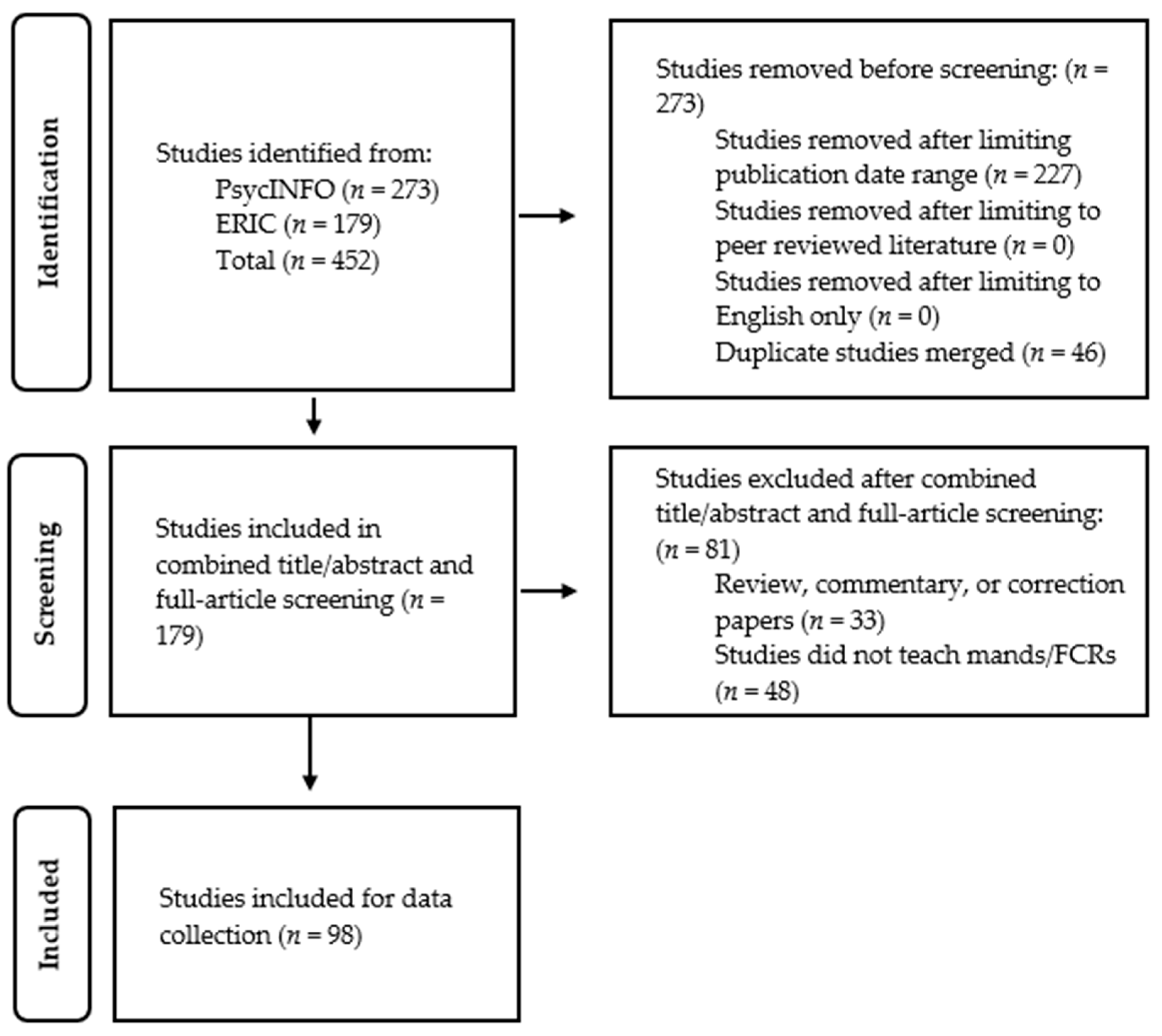 APA StyleDawson, K. W., Zangrillo, A. N., Bryan, S. J., Barall, R. J., & Wehr, C. G. (2026). Establishing Functional Communication Responses and Mands: A Scoping Review of Teaching Procedures and Implications for Future Investigation. Behavioral Sciences, 16(2), 182. https://doi.org/10.3390/bs16020182