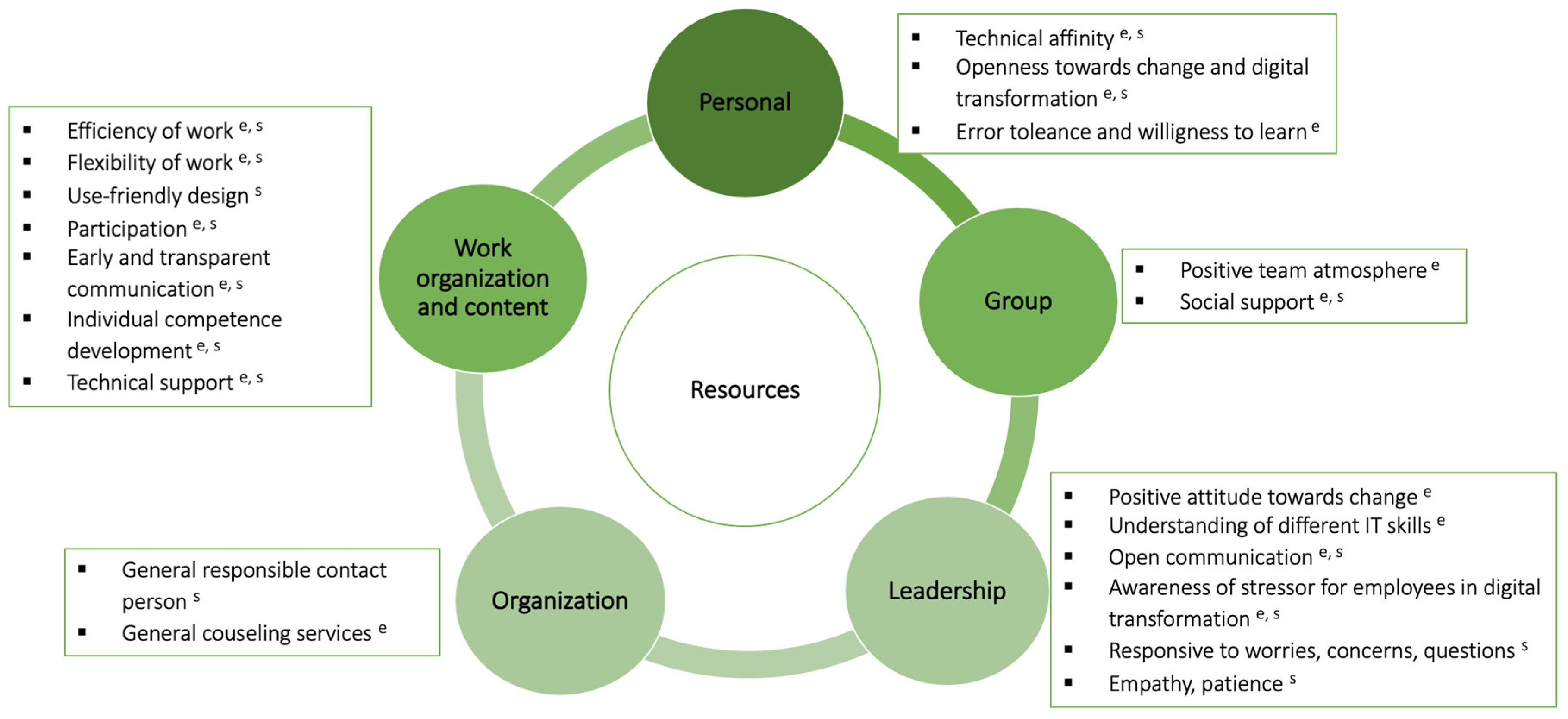 - Leadership: Supervisors should model a positive attitude toward digital transformation to inspire motivation and openness. They also bear responsibility for employees’ well-being during digital change by being approachable, addressing concerns, and effectively communicating team needs to higher management.