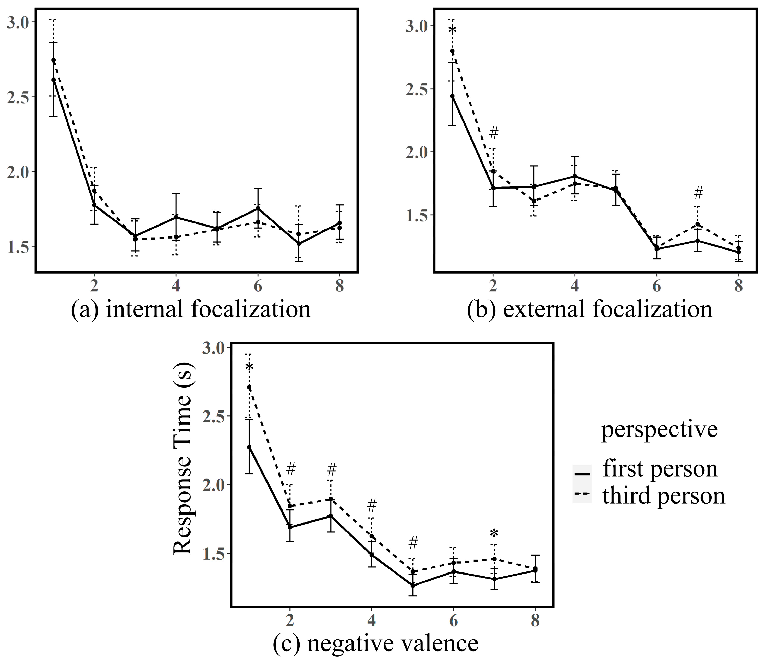 2020) provided direct evidence for emotional moderation of perspective effects. In their eye-tracking study, negatively valenced texts produced distinct processing patterns: third-person pronouns initially required longer processing times than second-person pronouns, but this pattern reversed as reading progressed, with third-person processing becoming increasingly efficient. No such dynamic emerged for positively valenced texts, suggesting that negative emotional contexts specifically amplify perspective-based processing differences. This finding aligns with theoretical predictions that emotional intensity enhances sensitivity to narrative structural features.