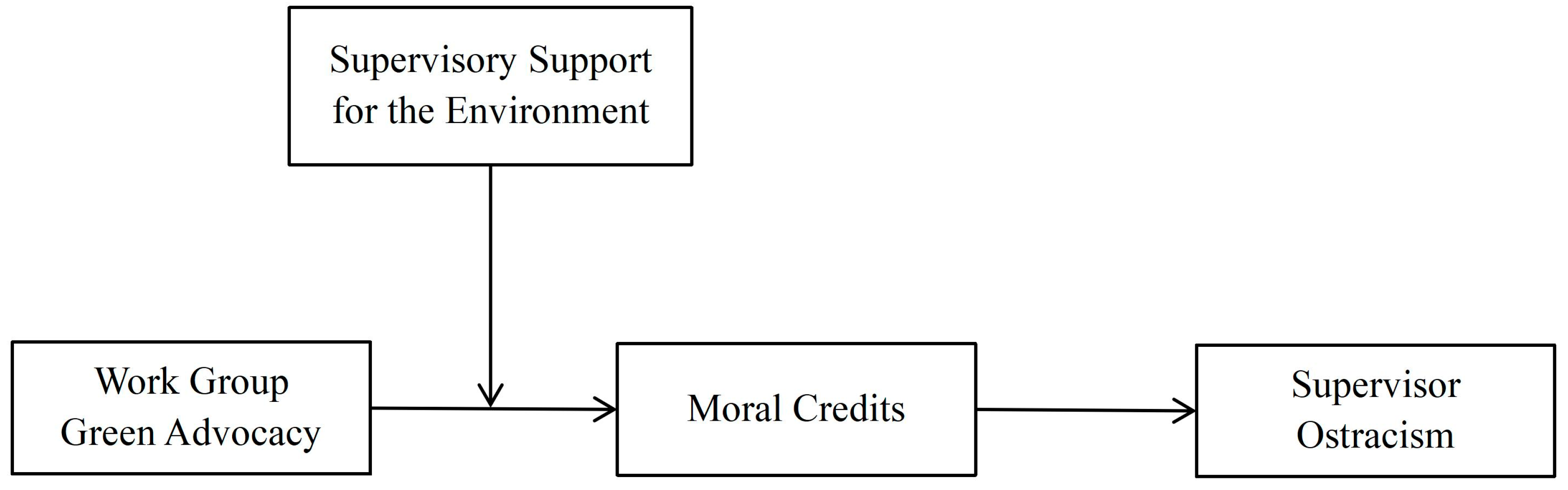 Furthermore, we contend that the efficacy of this signal is contingent on the receiver’s values. The meaning and value of a signal are not inherent but are interpreted by the receiver (Connelly et al., 2011, 2025; Taj, 2016). Thus, we propose that supervisory support for the environment (SSE) will moderate this process. When a supervisor personally values environmental sustainability, an employee’s green advocacy is a more salient and credible signal of positive character, amplifying the accumulation of moral credits and strengthening the indirect, protective effect against ostracism (Lindsey et al., 2017).