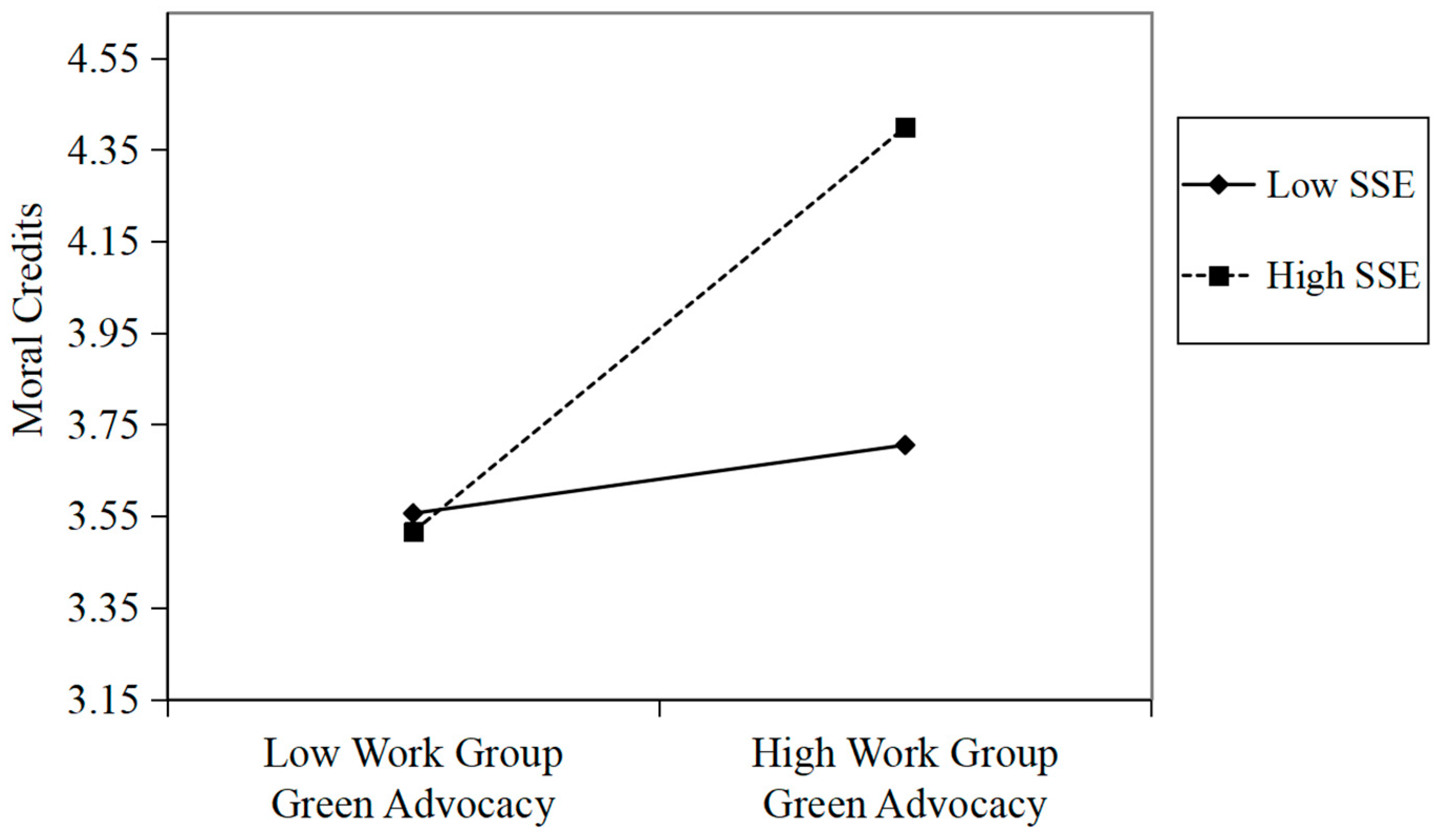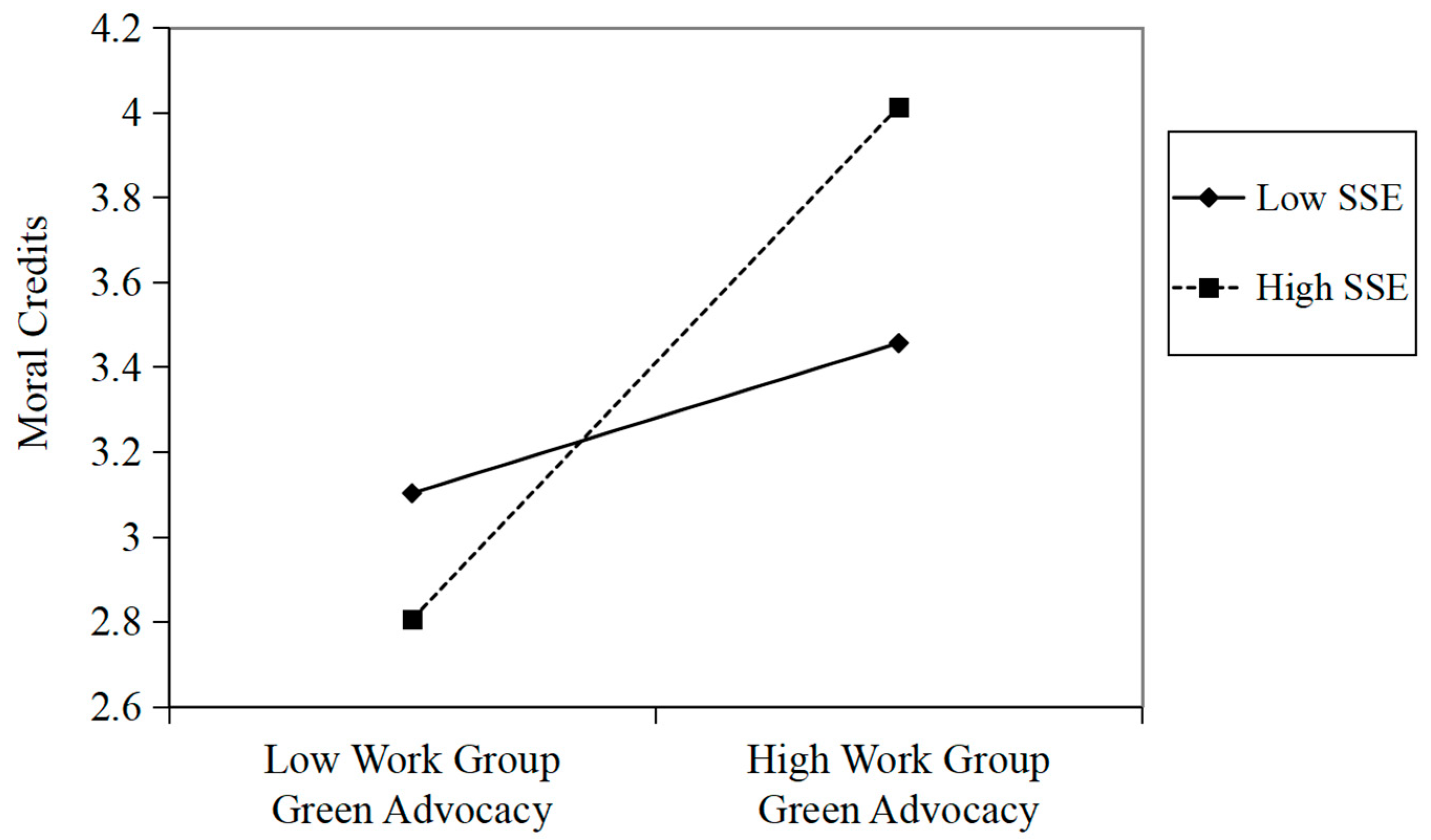 Figure 3. The moderating effect of SSE on the relationship between work group green advocacy and moral credits in study 1. Note. SSE = supervisory support for the environment.