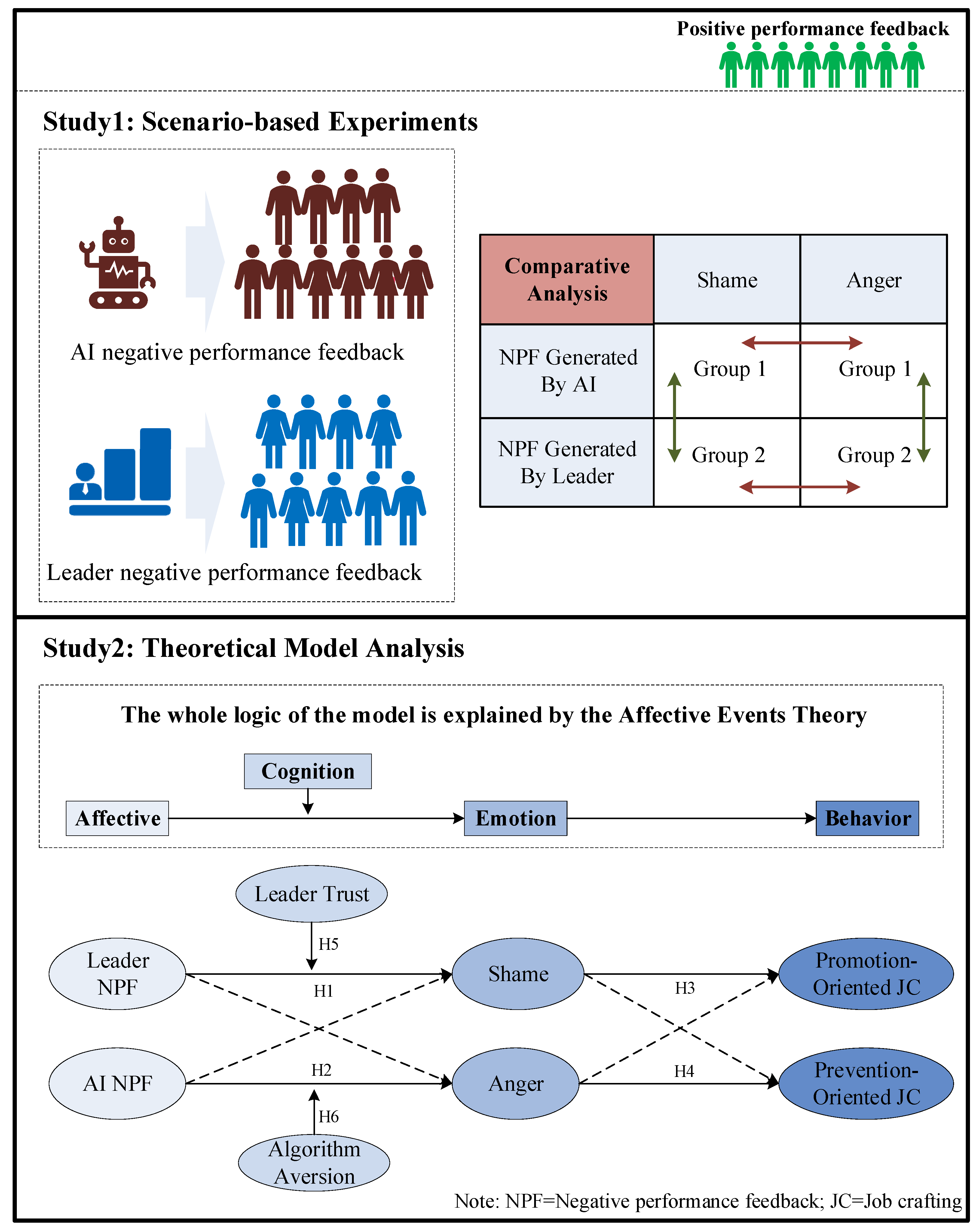 This study makes several contributions. First, it advances the feedback literature by demonstrating that the source of negative performance feedback (leader vs. AI) triggers distinct emotional responses—shame and anger—that in turn drive different forms of job crafting. In doing so, it moves beyond the dominant focus on feedback content and fairness to highlight the importance of feedback source as an affective trigger. Second, by integrating Affective Events Theory with the job crafting perspective, this study enriches our understanding of how discrete emotions channel employee reactions into promotion- versus prevention-oriented behaviors, thereby offering a more nuanced account of the feedback–behavior link. Third, this research identifies boundary conditions, namely leader trust and algorithm aversion, that shape the intensity and direction of emotional reactions, extending knowledge on when and why employees accept or resist feedback in digitized contexts. Finally, the findings provide timely insights for organizations navigating the growing use of algorithmic management, underscoring the need to balance efficiency with emotional and motivational employee dynamics in performance evaluation practices. The rest of this study is organized as follows.