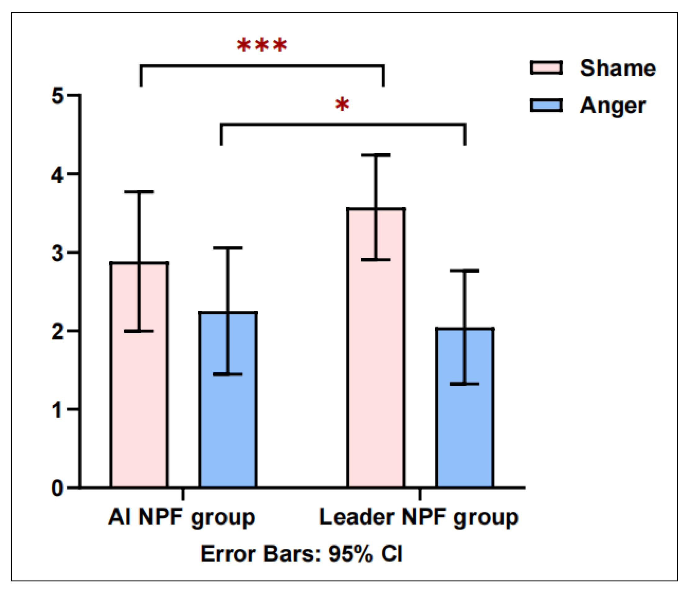 Figure 2, employees in the AI negative performance feedback group reported significantly lower levels of shame (Mean = 2.883, SD = 0.885) compared with those in the leader negative performance feedback group (Mean = 3.573, SD = 0.667), t = −7.086,
