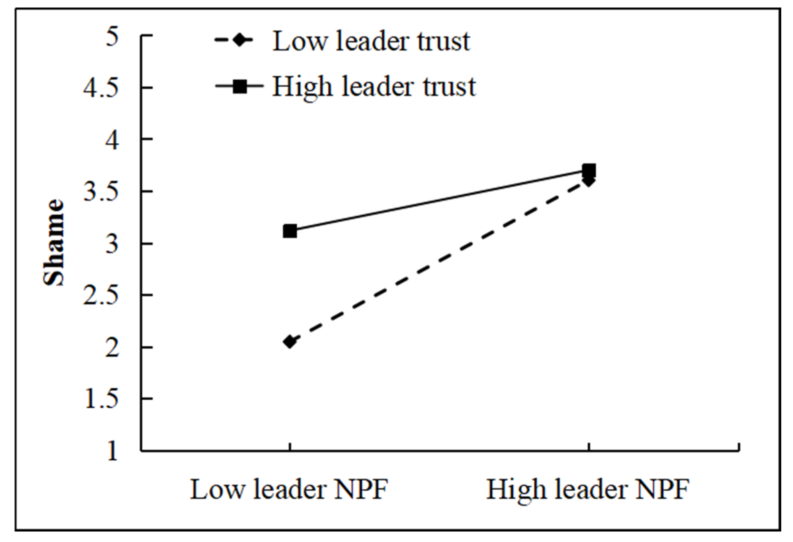 Figure 3, compared with low leader trust (Mean − 1 SD), high leader trust (Mean + 1 SD) significantly weakened the positive effect of leader negative feedback on shame. Thus, H5 was further supported. In addition,