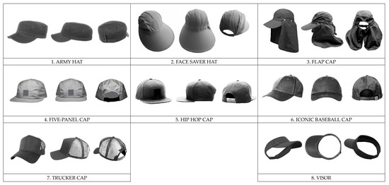 The 8 baseball cap models (set 2) used in the study.