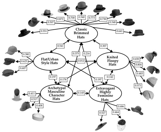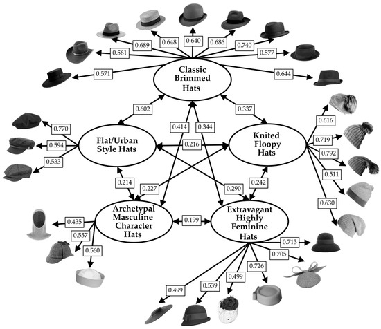 Latent factor correlations ranged from 0.012 to 0.541 (mean = 0.220), indicating related but distinct dimensions of hat preferences. McDonald’s ω reliability was adequate for all factors (F1 = 0.664; F2 = 0.685; F3 = 0.742; F4 = 0.672; F5 = 0.897).