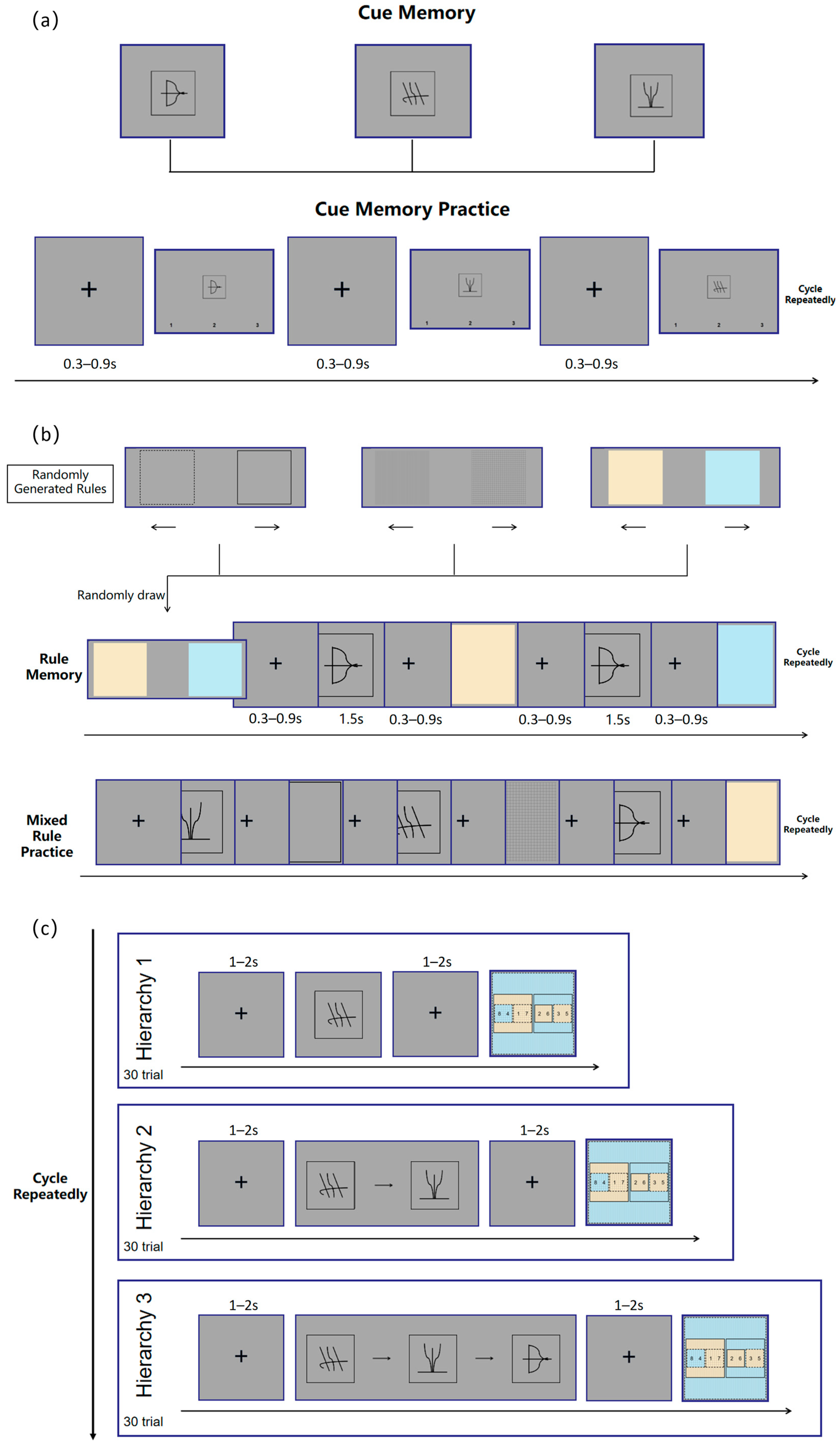 - Mixed Rule Practice. This phase tested participants’ memory of all three rules. Each feature was presented in five trials, resulting in 10 trials per rule. The three rules were randomly intermixed, producing a total of 30 trials. The trial procedure was identical to that used in the rule memory phase, and the overall process is shown in Figure 1b.