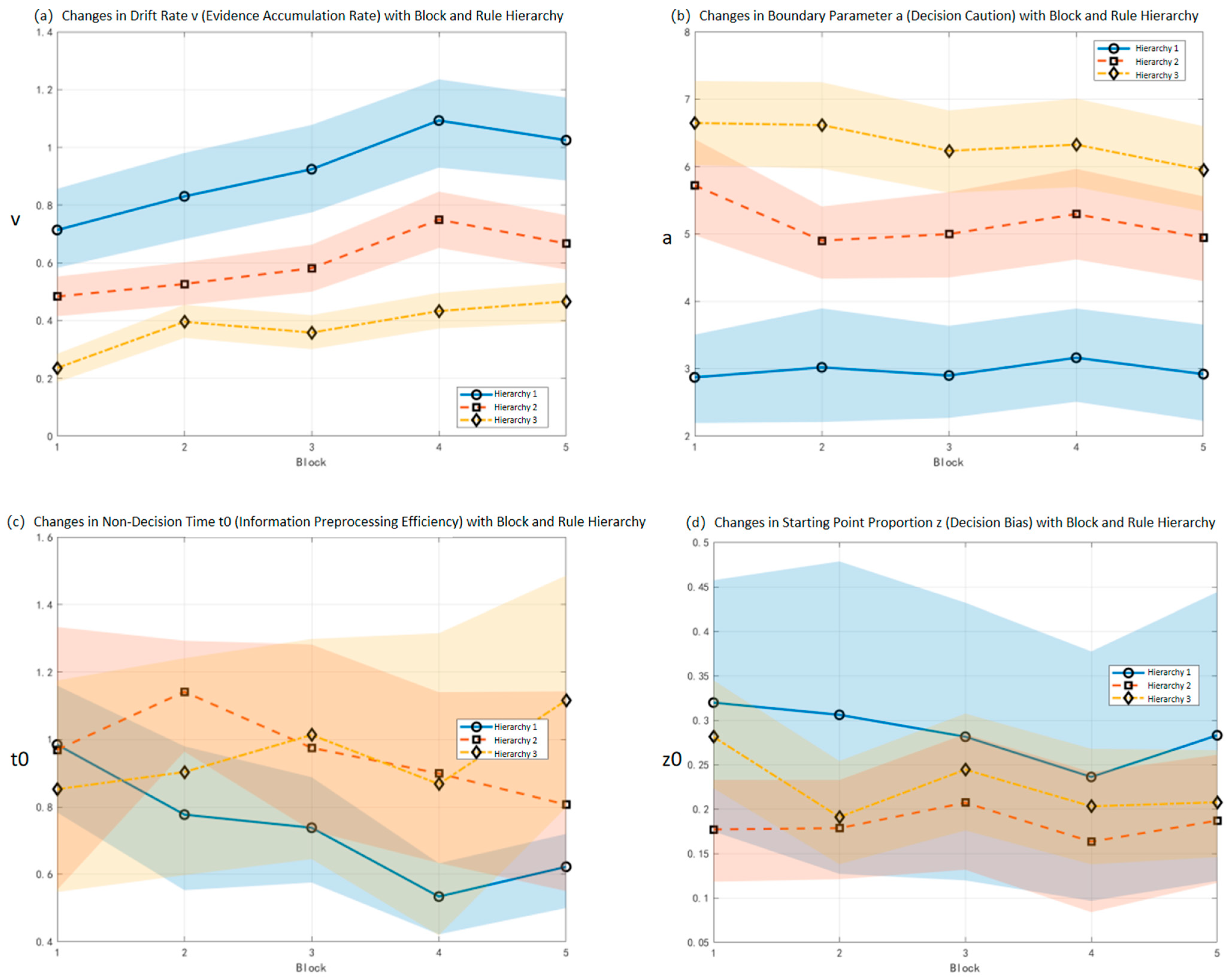 | Drift Rate (v) | Rule Hierarchy | Hierarchy 1: 0.92 | Hierarchy 1: [0.85, 0.99] | All show the consistent trend of “the lower the Rule Hierarchy, the significantly higher the drift rate” with Models 1 and 3, indicating that the regulatory effect of Rule Hierarchy on information accumulation rate is robust. |