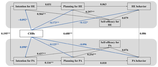 In this integrated model, the previously observed direct effects of CHBs on HE intention, planning, and behavior remained stable and significant, further reinforcing H1. The positive link between CHBs and PA intention (H1-alt-b) also persisted. Crucially, the previously significant direct negative path from CHBs to PA planning became non-significant (β = −0.071, p = 0.101). This change indicates that the initial direct association between CHBs and PA planning was accounted for by the newly introduced self-efficacy pathways, a pattern consistent with an indirect-only mediation model.