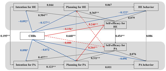 Optimized Dual-Pathway Model Integrating Self-Efficacy. Note. The model incorporates self-efficacy pathways to test the dual-process mechanisms (direct intention compensation and indirect self-efficacy erosion) underlying compensatory health beliefs (CHBs). Black lines represent the established HAPA intention–planning–behavior sequences within each domain. Blue solid lines depict the direct intention compensation pathway (moral licensing), corresponding to H1–H3. Red lines represent the indirect cognitive erosion pathway via self-efficacy: solid red lines (CHBs → HE SE and HE SE → PA planning) illustrate H4a and H5b, which together constitute the indirect effect (H6a) of CHBs on PA planning through HE SE; dashed red lines (CHBs → PA SE and PA SE → HE planning) illustrate H4b and H5a, which together represent the hypothesized but nonsignificant indirect effect (H6b) of CHBs on HE planning through PA SE. Standardized coefficients are shown. Solid lines represent significant paths (* p < 0.05, ** p < 0.01); the nonsignificant path from CHBs to physical activity (PA)-specific self-efficacy is omitted for clarity. HE = healthy eating; SE = self-efficacy. Key illustrated associations: CHBs → HE Self-Efficacy (β = −0.156 *); HE Self-Efficacy → PA Planning (β = 0.264 **); PA Self-Efficacy → HE Planning (β = 0.240 **). Bayesian mediation analysis confirmed the significant indirect association of CHBs with PA planning through HE self-efficacy.