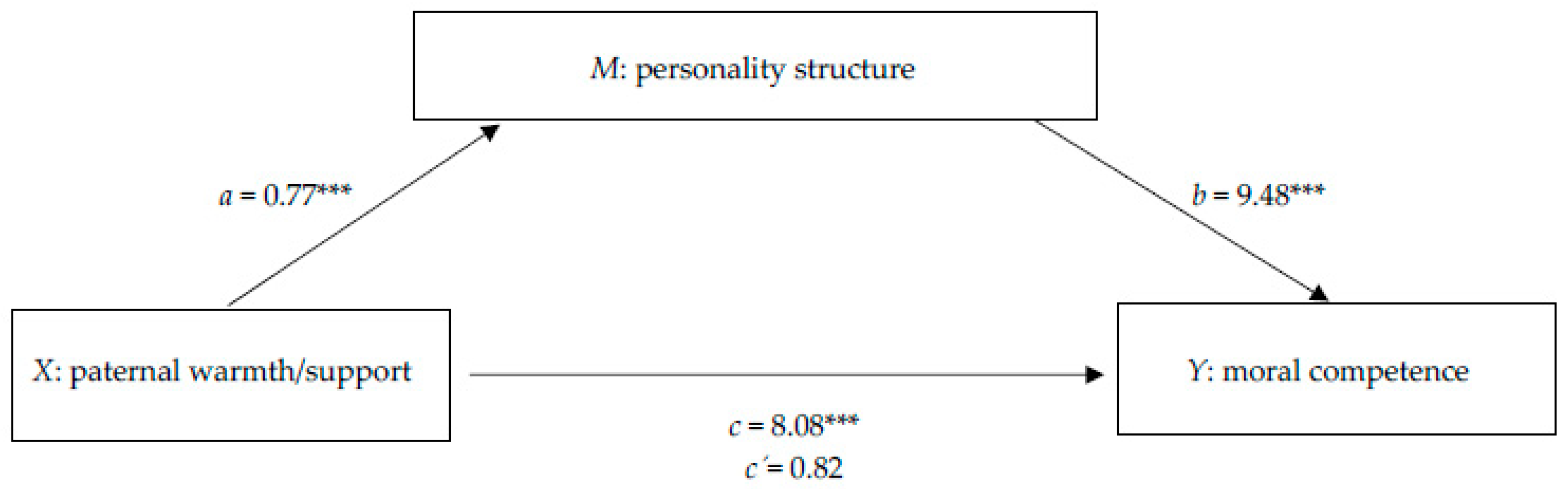 Based on the regression analyses above, only paternal warmth/support significantly predicted both moral competence and personality structure. Mediation analysis confirmed that the effect of paternal warmth/support on moral competence was fully mediated by personality structure (