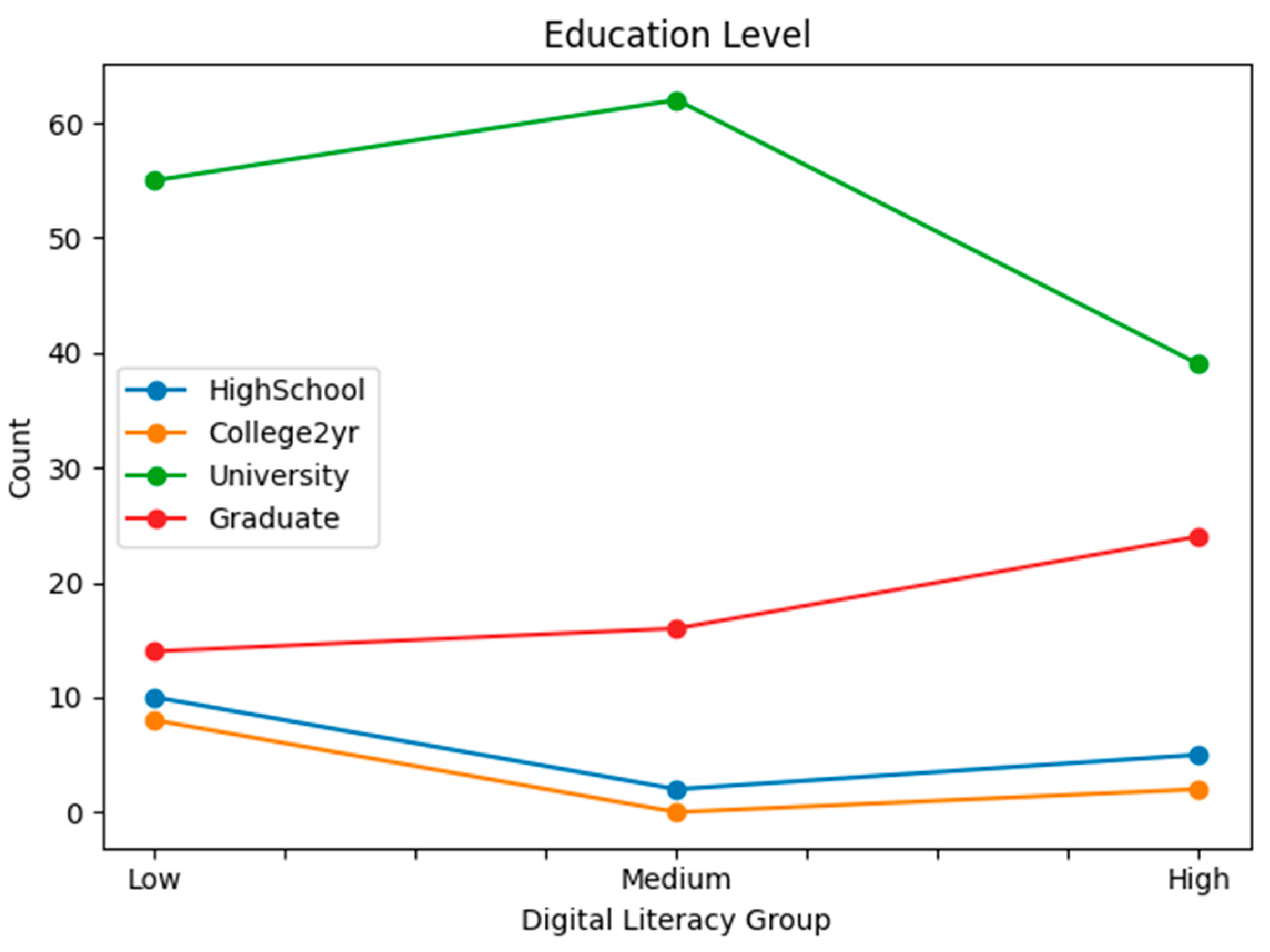 - Kabakus, A. K., Bahcekapili, E., & Ayaz, A. (2025). The effect of digital literacy on technology acceptance: An evaluation on administrative staff in higher education. Journal of Information Science, 51(4), 930–941. [Google Scholar] [CrossRef]