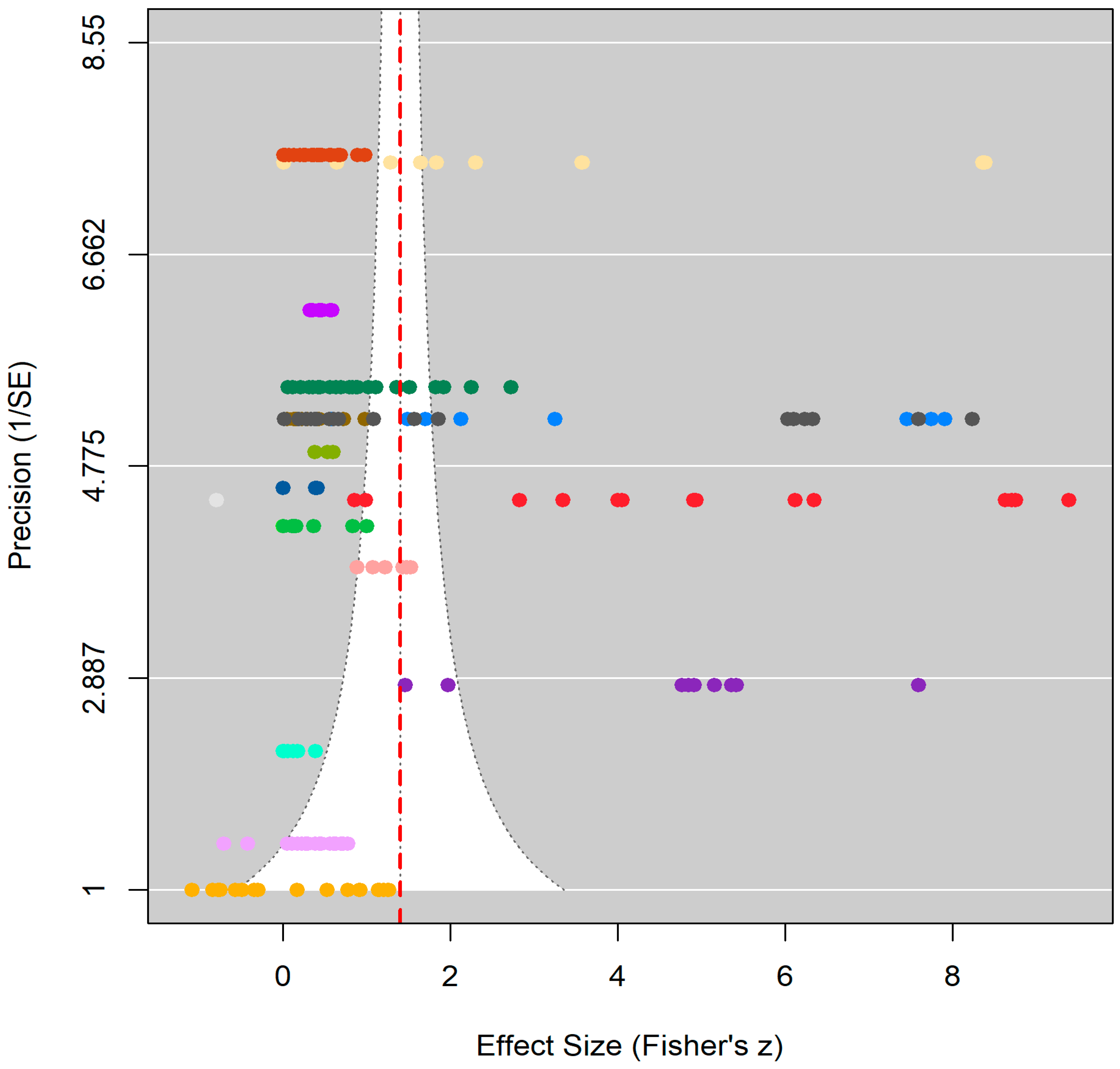 - Kossmeier, M., Tran, U. S., & Voracek, M. (2020). Power-enhanced funnel plots for meta-analysis: The sunset funnel plot. Zeitschrift für Psychologie, 228(1), 43–49. [Google Scholar] [CrossRef]