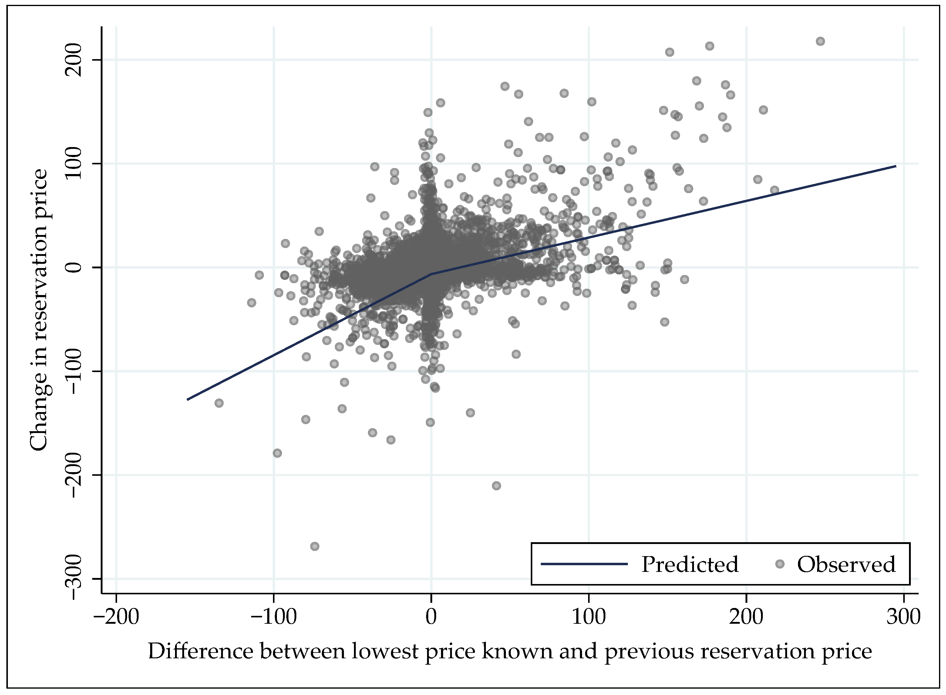 - and : is significantly greater than zero (, ) and smaller than one (, ). For , results are mixed: the estimate is significantly greater than zero (, ) but not smaller than one (, ). The latter result is driven by cluster-robust standard errors; with conventional standard errors, the estimate is significantly smaller than one (, ). Thus, the lower-bound part of the hypothesis is supported, while the upper-bound part is supported under the assumption of independent and identically distributed error terms. The lower-bound part is sufficient for downward adjustments of the reservation price.