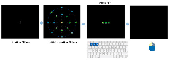 Peripheral stimuli were presented at 16 possible locations arranged on two concentric rings centered on the fixation point. Each ring contained eight positions equally spaced at 45° intervals (0°, 45°, 90°, 135°, 180°, 225°, 270°, and 315°). The inner ring was located at an eccentricity of 10°, and the outer ring at 16° of visual angle from the fixation. The spatial positions of the peripheral stimuli were defined in degrees of visual angle and converted to screen coordinates based on the viewing distance and screen geometry using trigonometric conversion. All stimulus icons subtended approximately 1° × 1° of visual angle. Figure 1 illustrates the experimental apparatus and the visual stimuli.