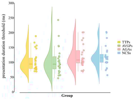 A one-way between-subject ANOVA was conducted on the Subtest 1 presentation duration threshold with group (TTPs, AVGPs, AGAs, NCSs) as the between-subject factor. The main effect of group was not significant, F(3, 100) = 1.32, p = 0.271, ηp2 = 0.038, indicating comparable central identification speed across groups (TTPs: 105.12 ± 33.49 ms; AVGPs: 103.74 ± 44.38 ms; AGAs: 117.48 ± 37.47; NCSs: 121.11 ± 38.52). The distribution of presentation duration thresholds across groups is shown in Figure 5.