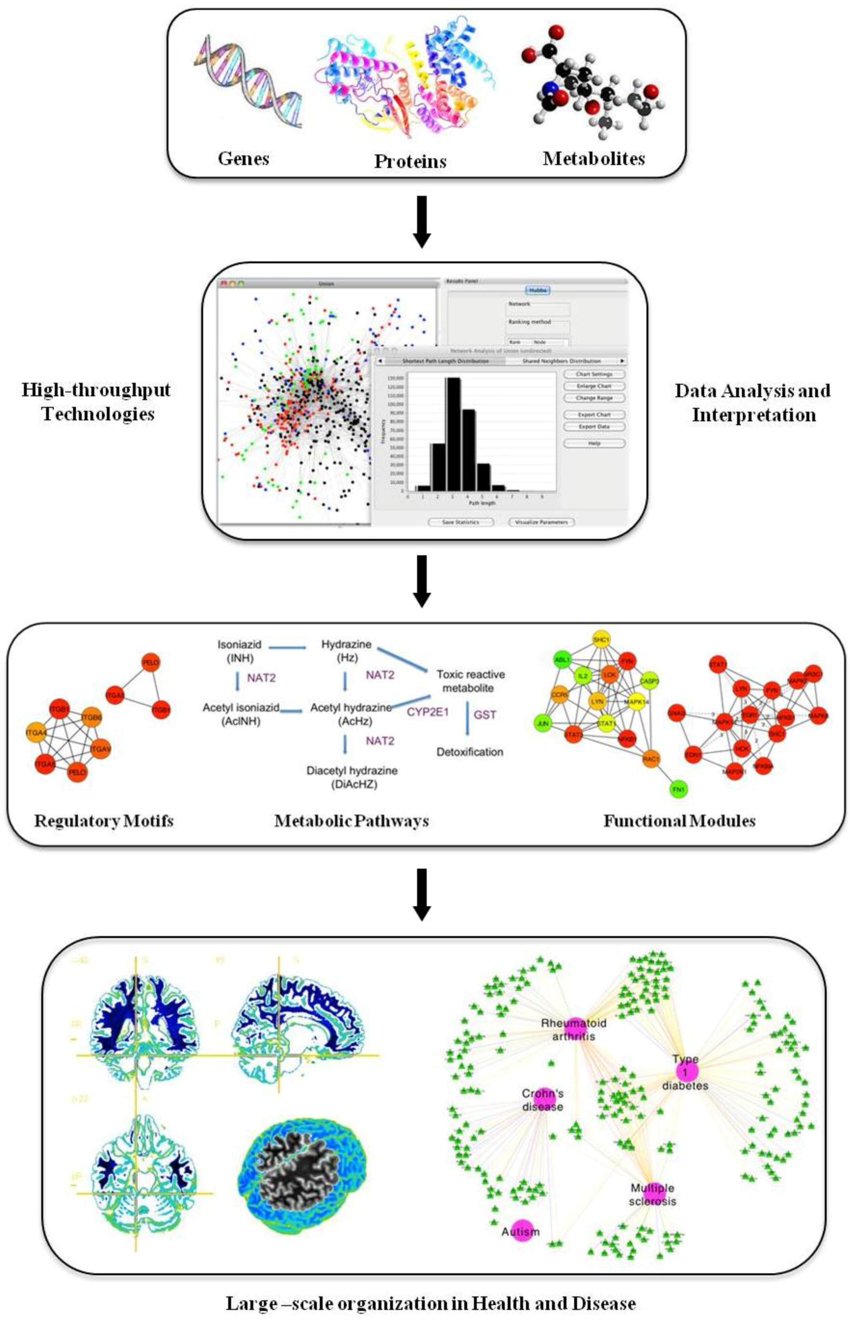 1]. As already mentioned, the different types of networks should not be considered in isolation, since they work together as a whole system, assembling a structured hierarchical network. For this reason, an alteration in a protein-protein interaction not only affects the protein interaction network, but it may also alter the metabolic network, having both perturbations and an associated effect in the final phenotype. Unfortunately, interrelations among disparate networks are not well known yet, although systems biology promises a better comprehension of biological network as a whole. The fast development of high-throughput technologies and the increasing use of computer science methods in the life sciences enclose the key to unravel the underlying mechanisms that control the transition from health to disease and set the guidelines that systems biology research will surely follow.