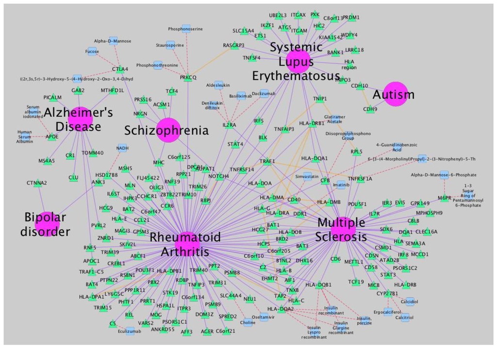9]. Data to build the network is also provided by iCTNet. Several types of relationships (arcs) are represented: gene-disease association (purple), protein interaction among associated genes and select drug target interactions (red) and protein-protein interactions (orange). Node types are identified by shape and color: diseases (pink circle), genes (green triangle) and therapeutic drugs (blue square).