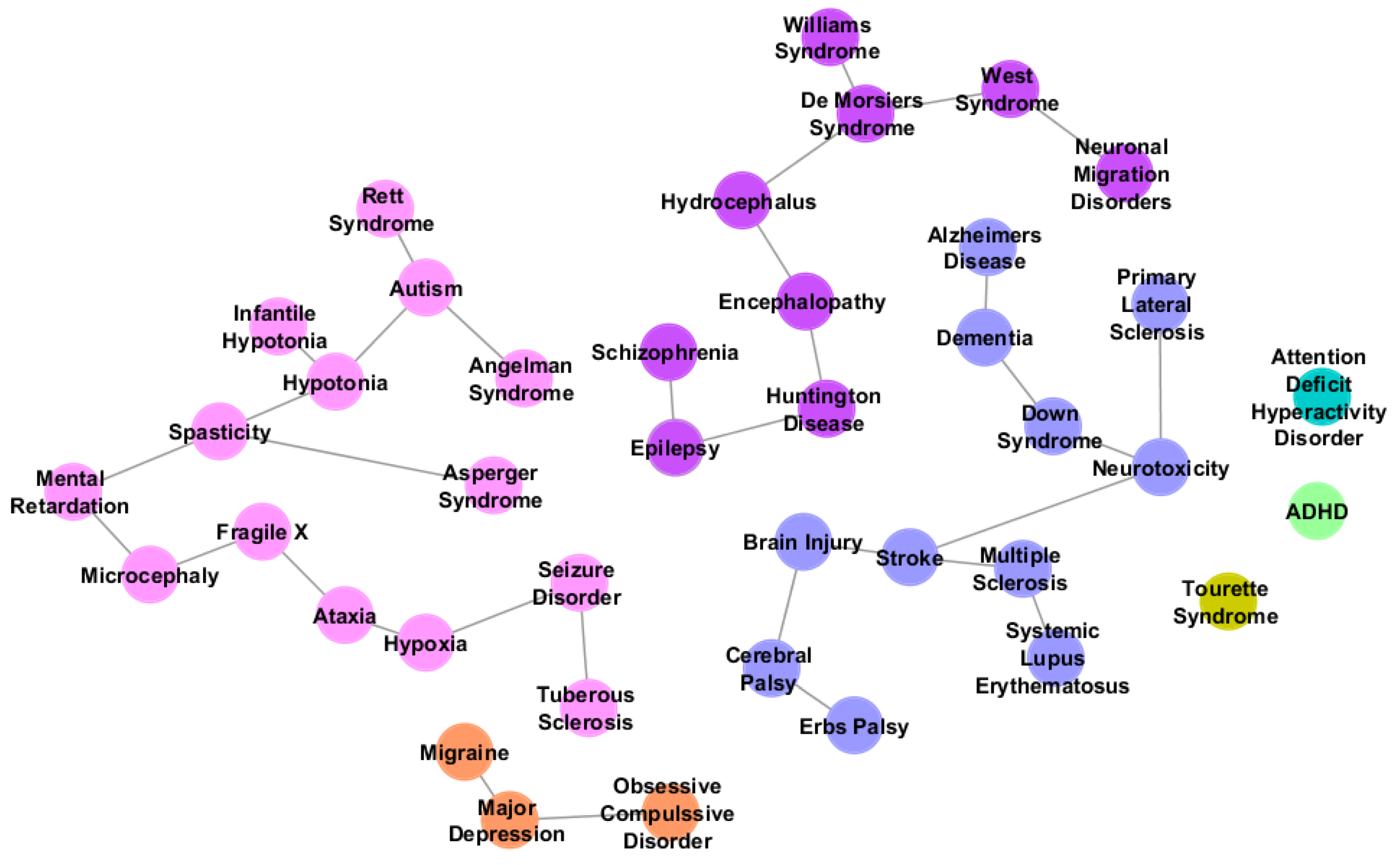 35]. Different groups of colors represent disorder phylogeny. Nodes in pink refer to the autism sibling group, disorders that appeared to be most closely related to autism.