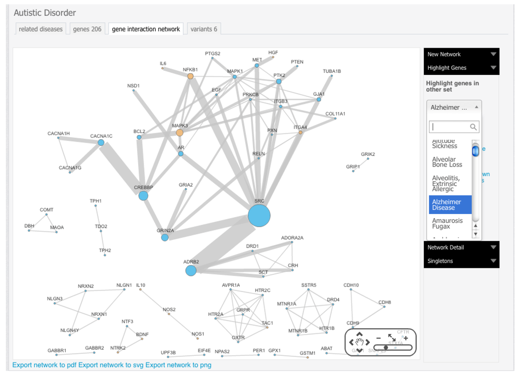 30] conducted a large comparative analysis of autism and another 432 neurological diseases to describe a multi-disorder subcomponent of ASD. The hypothesis to validate was that diseases with behavioral similarities with autism might share many genes with this disorder. Undeciphering this genetic overlap may contribute to a better comprehension of the range of different manifestations associated with autism. To characterize the multi-disorder component of the autism network, gene lists of 433 neurological diseases listed by NINDS (National Institute of Neurological Disorders and Stroke) were generated utilizing GeneCards [