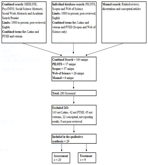 An EBSCO Information Services database search engine, covering MEDLINE, PsycINFO, Social Science Abstracts, Social Work Abstracts and Academic Search Premier, was used to identify potential sources from 1980 to the present limited to peer-reviewed publications and the English language. Separate searches of the Published International Literature on Traumatic Stress (PILOTS), Scopus and Web of Science databases were also performed. Individual search terms, including general phrases, such as Hispanic, Latino, posttraumatic stress disorder, PTSD or veteran, were too broad, yielding 56,576, 32,089, 34,061, 32,017 and 103,472 potential sources, respectively; therefore, one combined Boolean/phrase search was used. Terms to capture Latinos (Latino, Hispanic, Chicano and minorities) were combined with terms to capture PTSD (PTSD, posttraumatic stress disorder, posttraumatic stress, post trauma stress) and the term veteran. Duplicates were automatically removed by the search engine, and the citations were exported to RefWorks citation manager. Since the PILOTS database is specific to traumatic stress, only the terms to capture Latino were combined with veteran. The date last searched was March 19, 2014. The manual search included a review of reference lists from other reviews related to PTSD and minorities, dissertations and conceptual articles related to Latinos and Latino veterans with PTSD. Unique references from the PILOTS search and the manual review were added to RefWorks list for screening.