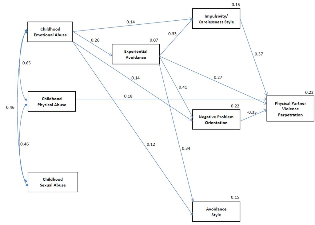 There were also some limitations noted with the study’s methodology. The current study was cross-sectional. Thus, the direction or temporal ordering of the relationships between variables could be different than what was predicted. Although the path analytic models tested in the current study were derived from existing theoretical and empirical literature on the relationships between childhood maltreatment, experiential avoidance, maladaptive social problem solving, and IPV, it is possible that IPV experiences could impact experiential avoidance and maladaptive social problem solving or that maladaptive social problem solving could affect experiential avoidance []. Future prospective research is needed to examine the temporal relationships between the current study’s variables. Additionally, the study did not assess the impact of witnessing family-of-origin violence, which can affect IPV risk []. Protective factors that dampen the impact of childhood maltreatment on short and long-term adverse outcomes, including IPV, also need to be explored []. Due to sample size restrictions and power limitations, separate path analyses were conducted for IPV perpetration and victimization. Given the comorbidity between IPV perpetration and victimization, the unique predictors of IPV perpetration and victimization are difficult to ascertain without including both variables in the same model []. Relatedly, although our study included over 200 participants, our participant/parameter ratio was slightly below the recommended 10:1 participant/parameter ratio []. Our analyses, therefore, may have been slightly underpowered and results should be considered preliminary. Replication of these models with larger sample sizes is needed to determine if similar significant direct and indirect pathways are obtained. Lastly, the study did not gather detailed information on the gender roles and orientations of participants and their partners. It is possible that IPV experienced in non-heterosexual relationships may appear topographically different and/or function differently in these relationships. Furthermore, factors contributing to IPV risk may be different between monogamous heterosexual relationships and other types of relationships. To date, limited research on the IPV characteristics and risk factors in gay, lesbian, bisexual, polyamorous, and transgender relationships has been conducted and future research in this area is desperately needed.