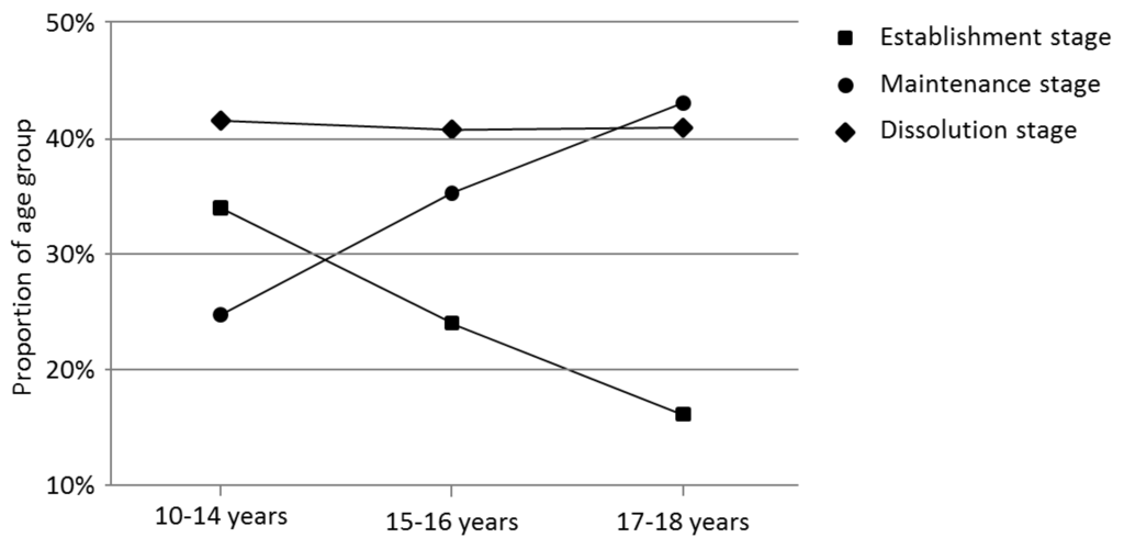 A significant association between the type of relationship concern and age was found, (F7, 3919 = 20.35, p < 0.001). Similarly, there was a significant association between romantic relationship stage and age group, χ2(4) = 120.69, p < 0.000 Cramer’s V = 0.12. Early adolescence was associated with an increased concern regarding establishment and a decreased concern regarding maintenance. Conversely, late adolescence was associated with a decreased concern regarding establishment and an increased concern regarding maintenance.