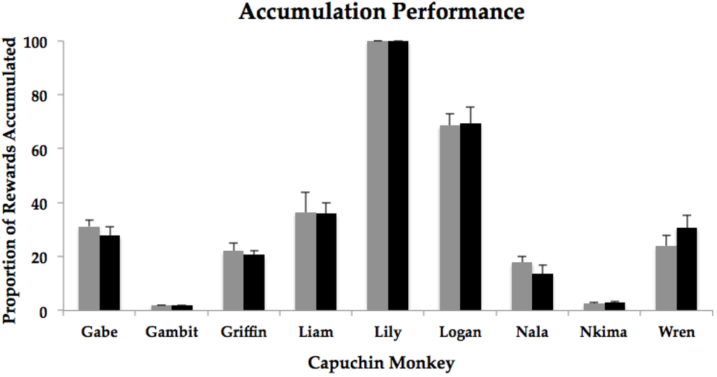 Accumulation performance for individual capuchin monkeys for the Low Glucose (gray bars) and High Glucose (black bars) conditions. Bars represent the mean proportion of rewards accumulated in each condition. Error bars depict standard error of the mean.