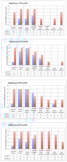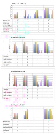 All participants showed an increase of complexity of SEAM behaviors towards the end of the therapy, with all profiles showing a combination of spatial, weight and time movement aspects at TP 4, which was not the case in the profiles at TP 1. Within-category analysis showed an increase for all eight markers over the four TPs. The development of SEAM behaviors over the four TPs followed a similar pattern structure for all cases.