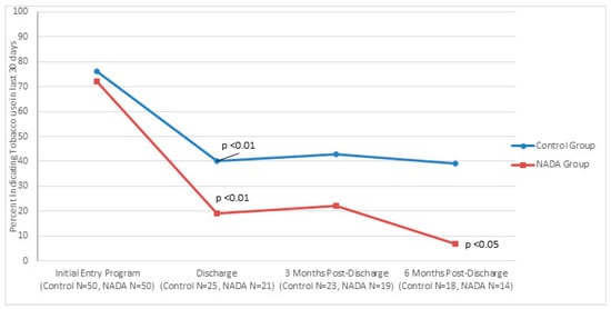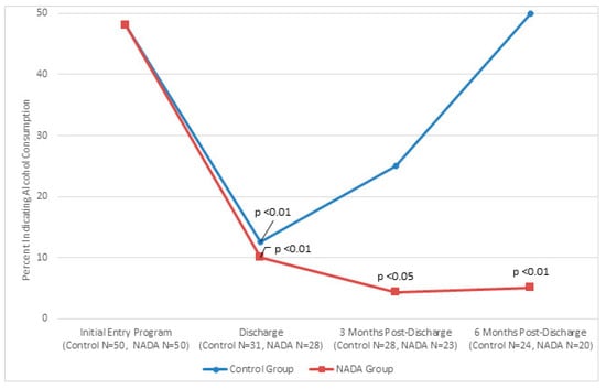 Figure 1, Figure 2 and Figure 3 show traditional and NADA treatment improved patient’s maintaining abstinence from consumption in regard to alcohol (NADA, χ2 = 11.56, p < 0.01; Control, χ2 = 10.93, p < 0.01), drug (NADA, χ2 = 16.84, p < 0.01; Control, χ2 = 8.97, p < 0.01 and tobacco (NADA, χ2 = 16.58, p < 0.01; Control, χ2 = 10.37, p < 0.01) between program entry and program completion.