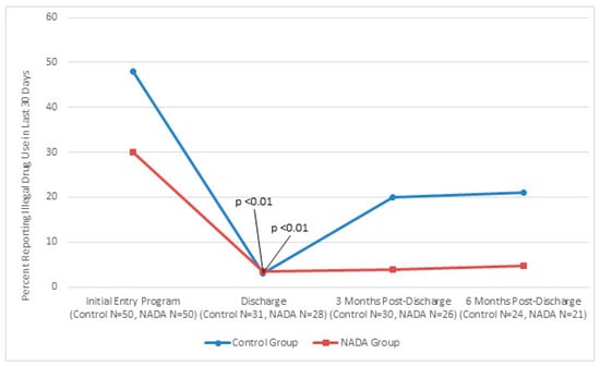 A reduction in healthcare utilization is found for both NADA and control group completers at time of discharge (NADA, χ2 = 20.14; Control, χ2 = 21.79; p < 0.01. Due to the small n each healthcare utilization category could not be separated out for analysis to draw meaningful inference. Healthcare utilization was grouped together and analysis is based on an indicator of general use versus nonuse. At 3 and 6 months the NADA group trended better than the control group in maintaining reduction in utilization of healthcare resources.