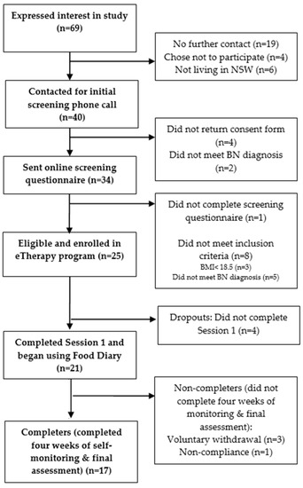 Of the 69 individuals who expressed interest, 26 females entered the study (See Figure 1). Participants were eligible for this study if they were aged between 16 to 65 years of age and met a full DSM-5 [52] diagnostic criteria for BN (purging or non-purging type). Participants below 18 years of age were required to provide parental consent. As assessed by the Eating Disorder Examination Questionnaire (EDE-Q) [53], participants must have engaged in OBEs and inappropriate compensatory behaviours (inclusive of vomiting, excessive laxative or diuretic use, extreme exercise or severe dietary restriction) at least once per week in the preceding 28 days from when the questionnaire was taken. The presence of such behaviours across the preceding three months was confirmed by a senior clinical psychologist with experience in treating ED patients who discussed symptom presentation with the patient in a thorough phone interview. As part of the interview, participants’ self-evaluation due to shape and weight, as assessed on the EDE-Q, was also confirmed.