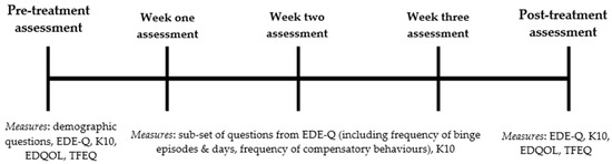 Schematic of the timing and sequence of assessments and included measures. Note: Week one, week two and week three assessments were identical. EDE-Q = Eating Disorder Examination-Questionnaire; K10 = Kessler Psychological Distress Scale; EDQOL = Eating Disorder Quality of Life Scale; TFEQ = Three Factor Eating Questionnaire.